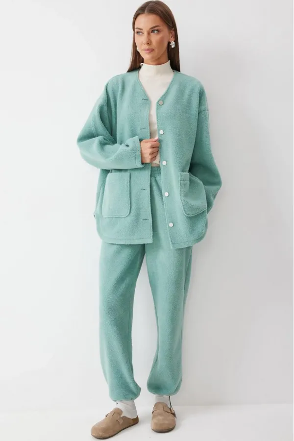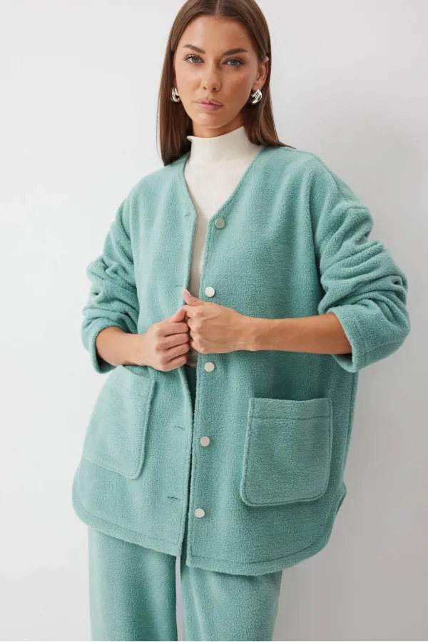 Жакет прямого силуэта с фигурным низом из трикотажного полотна. Горловина округлая, по центру застежка на кнопки. Рукав со спущенной линией плеча. По переду накладные карманы. Жакет без подкладки. Обращаем ваше внимание, что фурнитура может отличаться от фото.