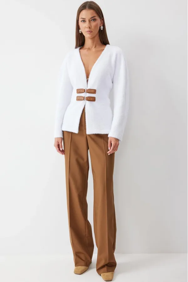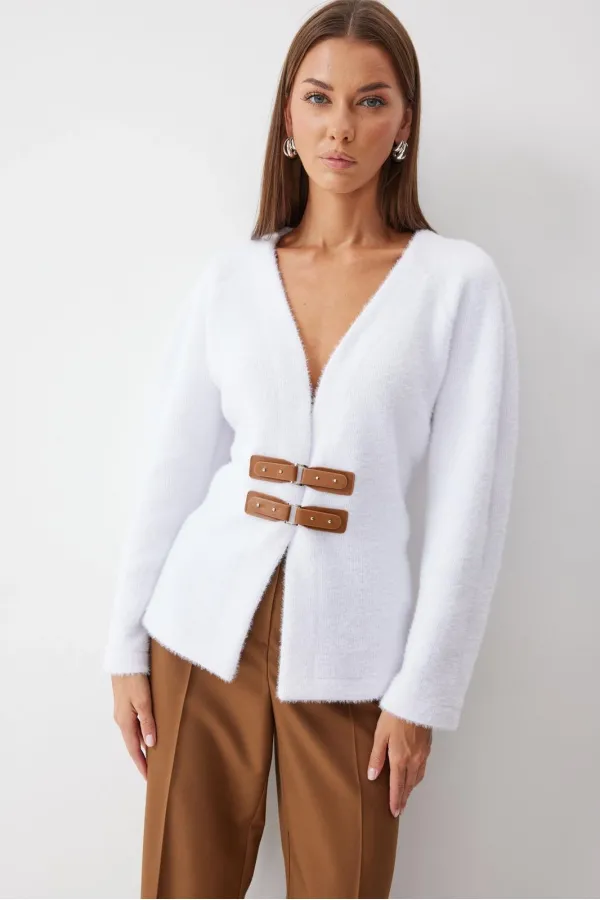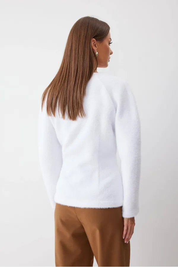 Джемпер полуприлегающего силуэта из трикотажного пушистого полотна. V-образная горловина, рукав реглан. По переду джемпера расположены пряжки. На спинке расположены вытачки, для придания силуэта. Обращаем ваше внимание, что фурнитура может незначительно отличаться от фото