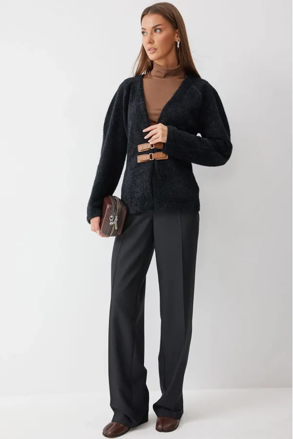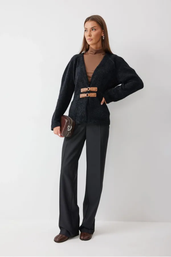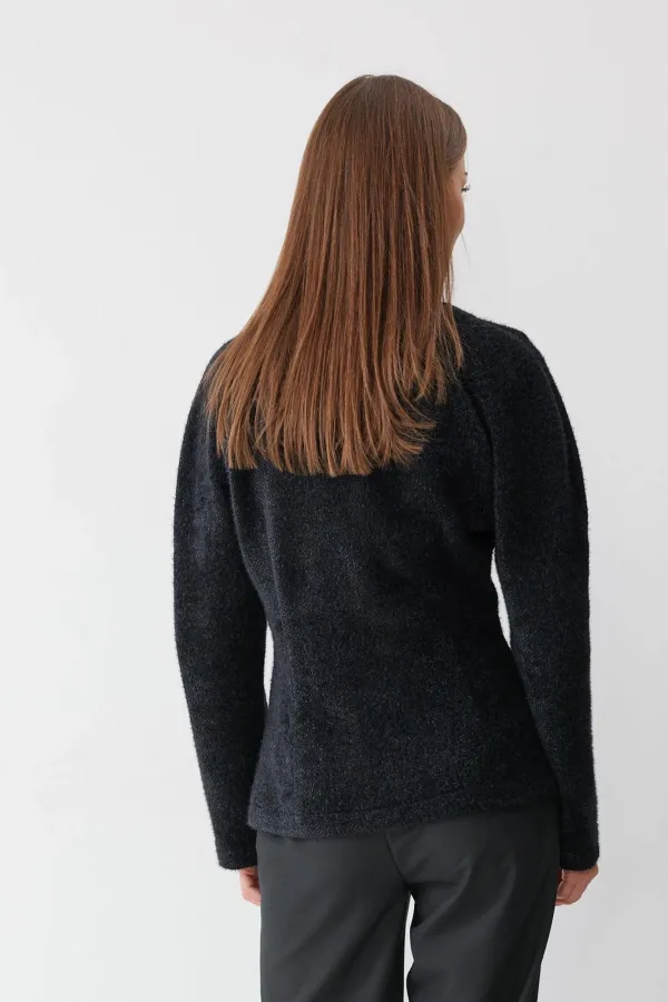 Джемпер полуприлегающего силуэта из трикотажного пушистого полотна. V-образная горловина, рукав реглан. По переду джемпера расположены пряжки. На спинке расположены вытачки, для придания силуэта. Обращаем ваше внимание, что фурнитура может незначительно отличаться от фото