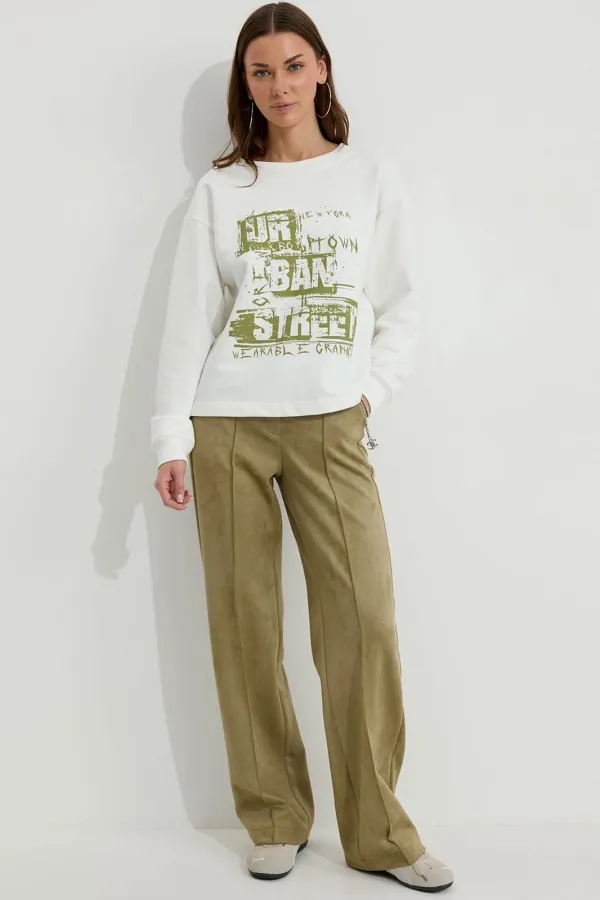 Джемпер прямого силуэта из трикотажного полотна. Горловина округлая. Рукав со спущенной линией плеча, по низу манжета. По переду дизайнерская печать.