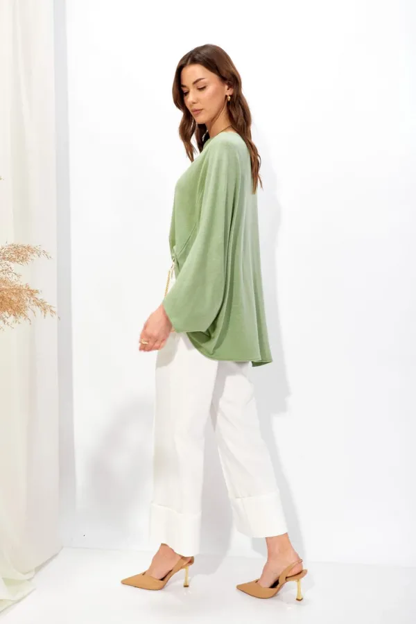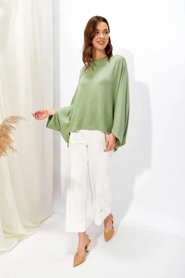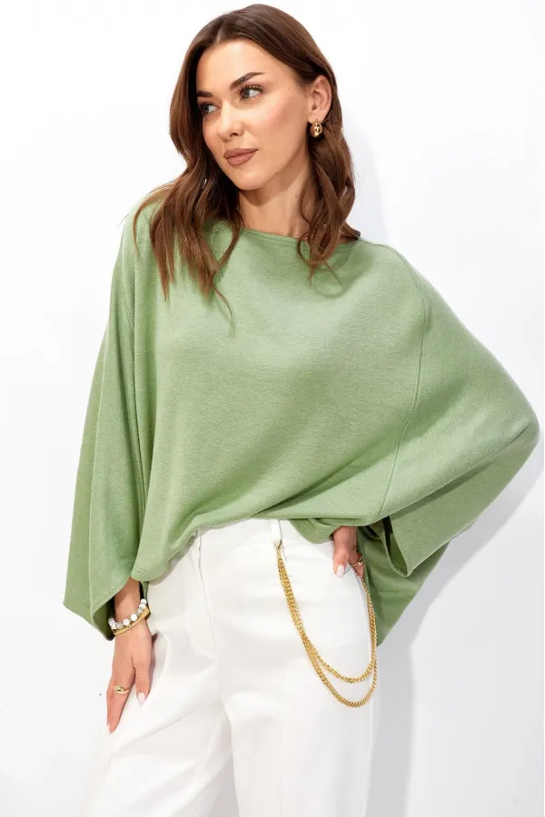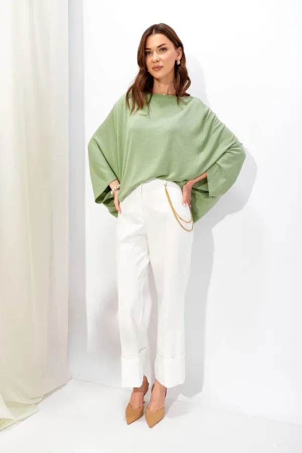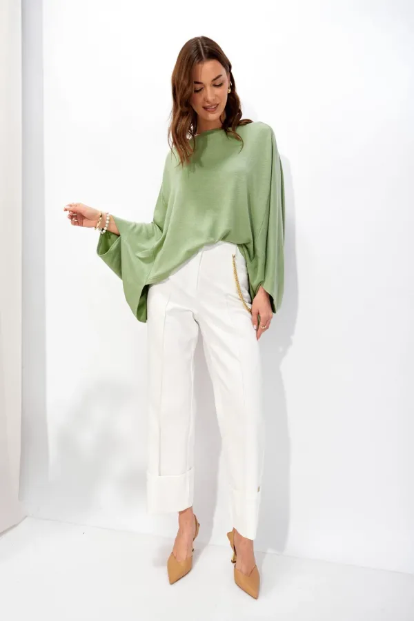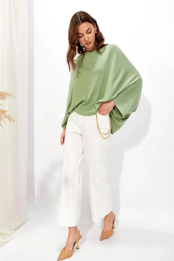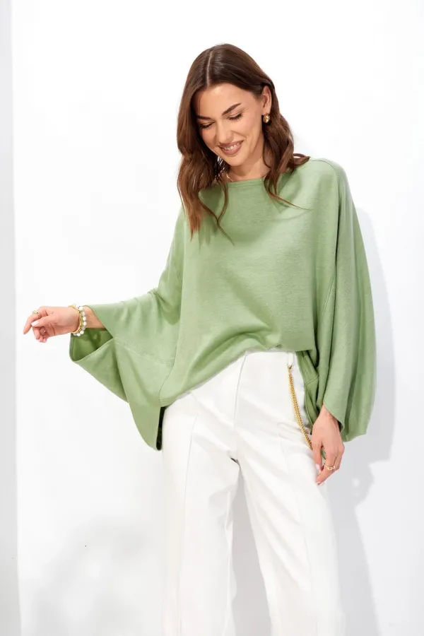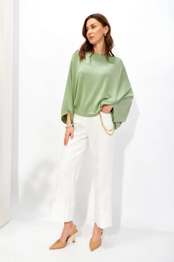 Джемпер свободного кроя из трикотажного полотна с фигурным низом. Горловина –лодочка. Рукав цельнокроеный.