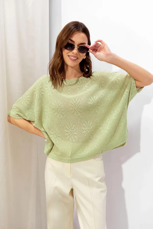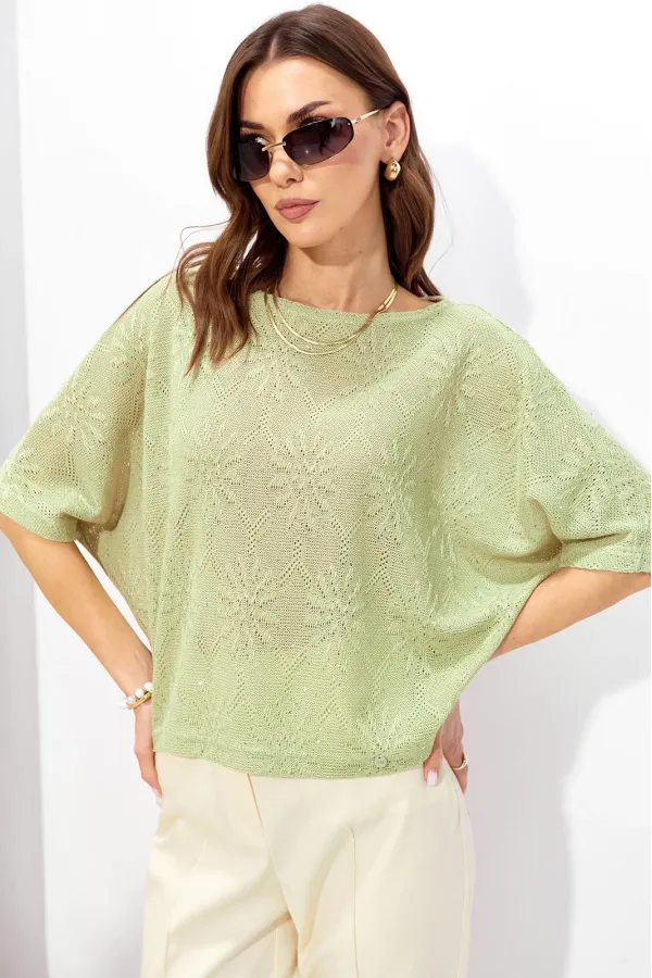 Джемпер покроя “летучая мышь” слегка зауженный книзу из трикотажного полотна. Горловина-лодочка. По низу джемпера в боковых швах разрезы, спинка длиннее переда.