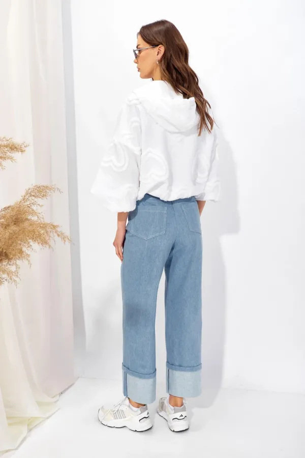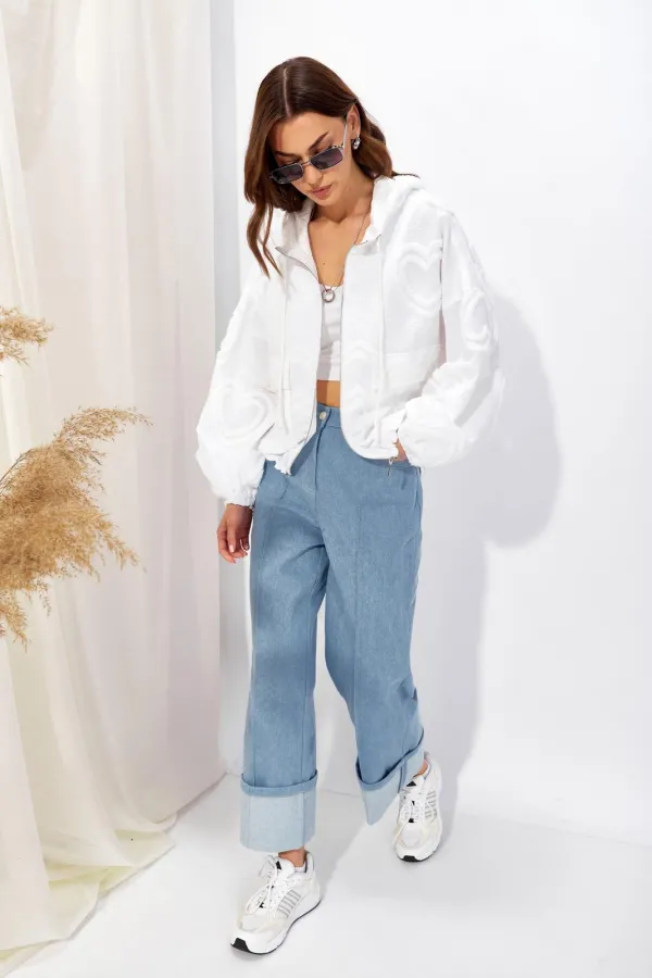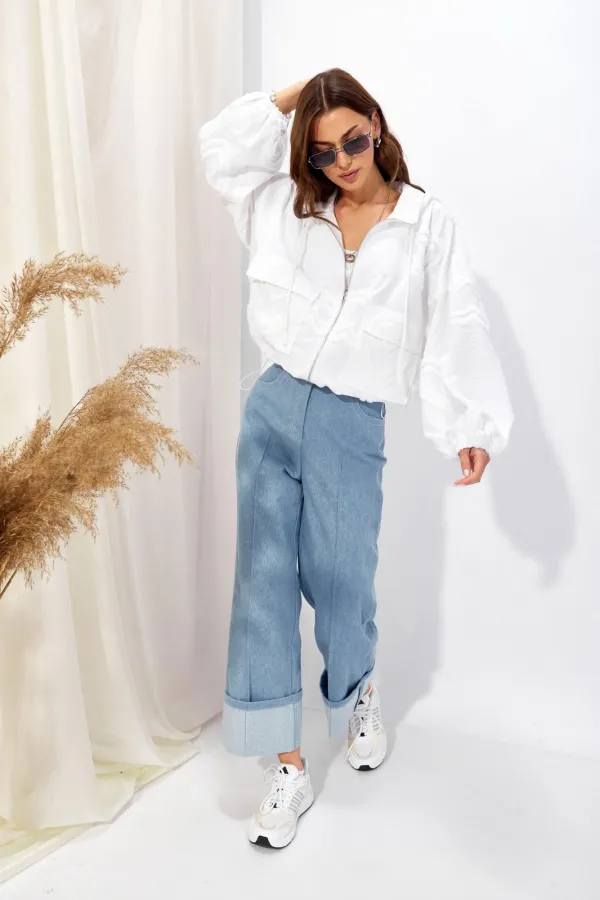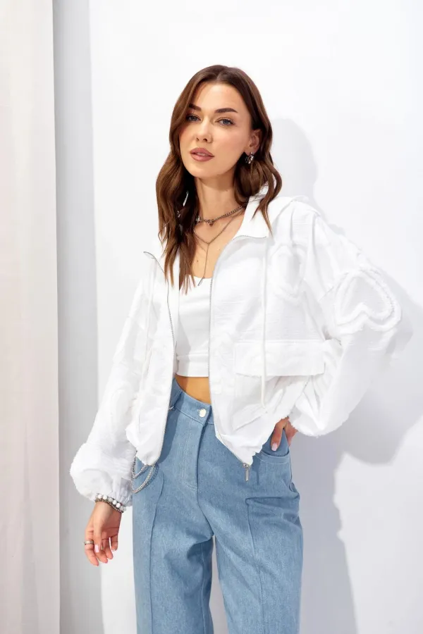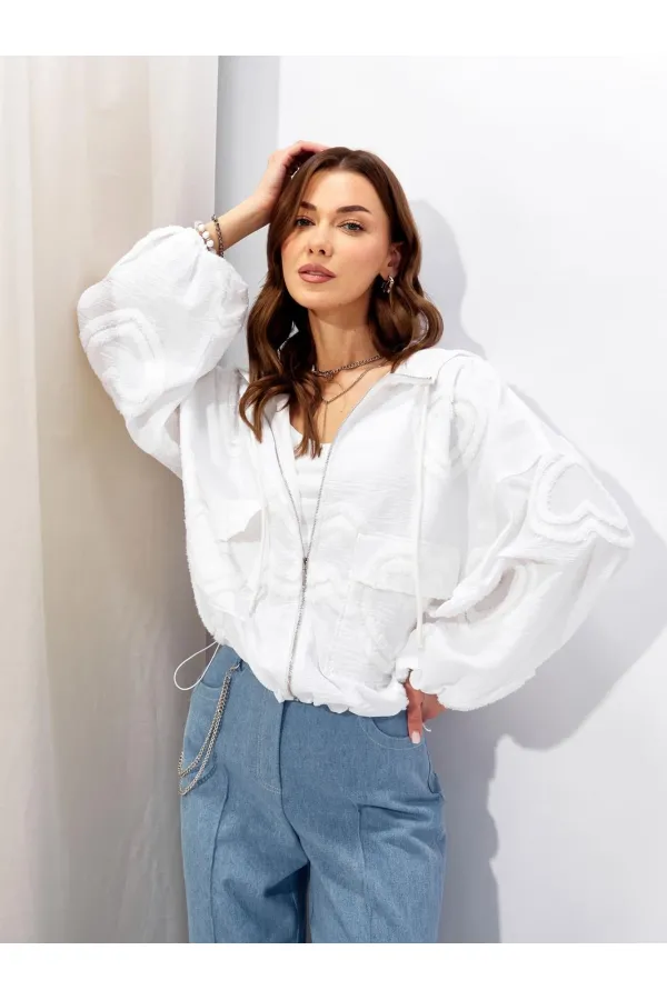 Жакет прямого силуэта из хлопковой ткани. Жакет с капюшоном на цельнокроенной стойке, с застежкой по центру на молнию. Рукав со спущенной линией плеча, по низу расширенный на резинке. По низу жакета резинка для регулиро... Читать далее...