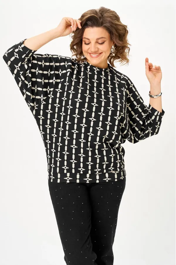 Рукав реглан — важная деталь: мягко формирует плечевую линию, не утяжеляет верх и делает посадку более деликатной. Свободный силуэт не обтягивает, но при этом не выглядит мешковато.