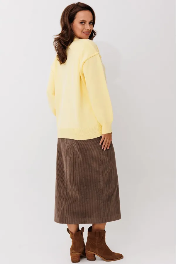Джемпер свободного силуэта. Горловина круглая, рукава спущенные, плечевые швы специально вывернуты на лицо изделия. Ткань мягкая, плотная, хорошшо держит форму.рукава и низ изделия на свободной вязанной резинке. По низу изделия декоративная нашивка.