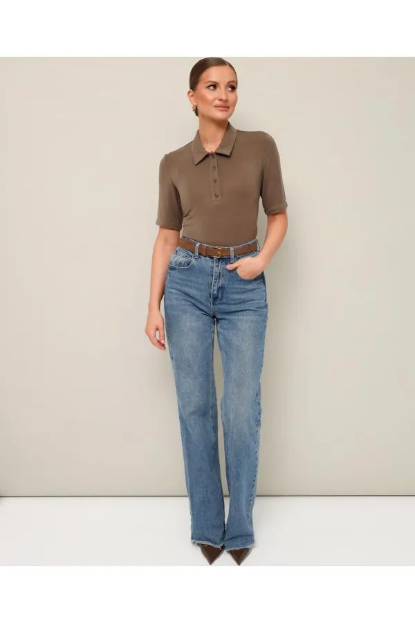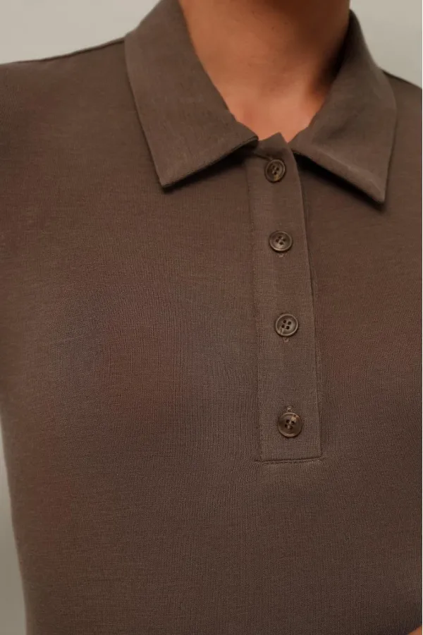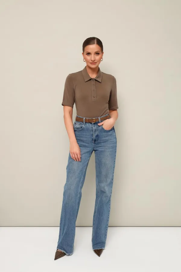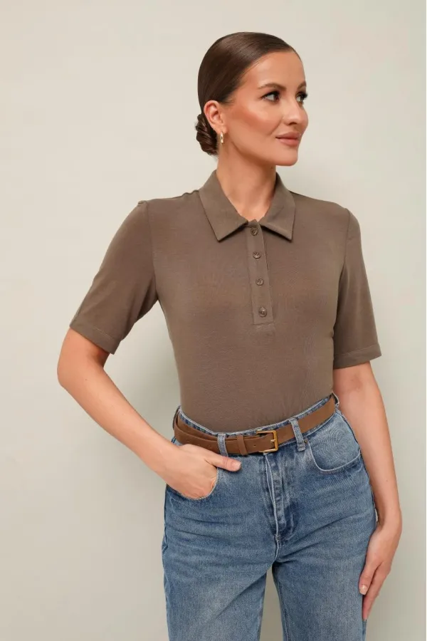 Трикотажное поло с отложным воротником с цельнокроеной стойкой. Вырез горловины обработан притачными планками с застежкой на петли и пуговицы. Короткие втачные рукава.