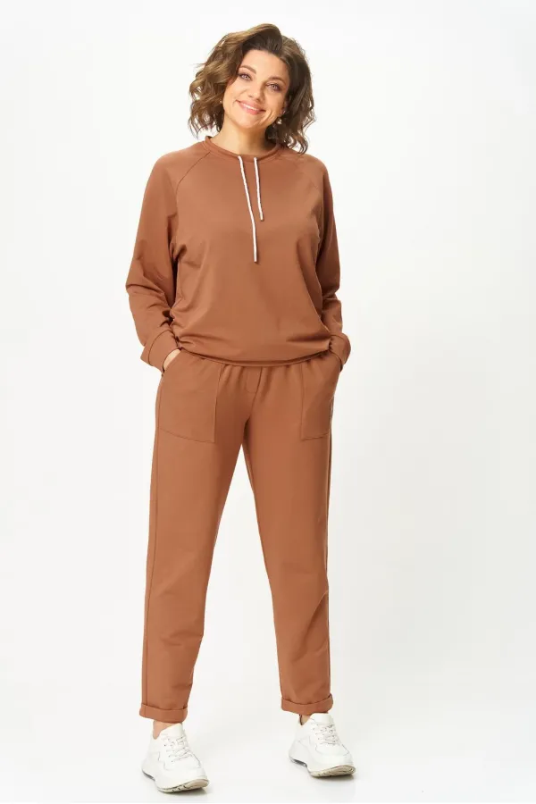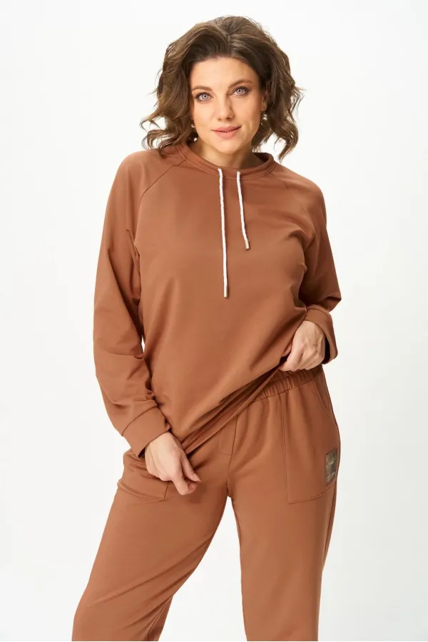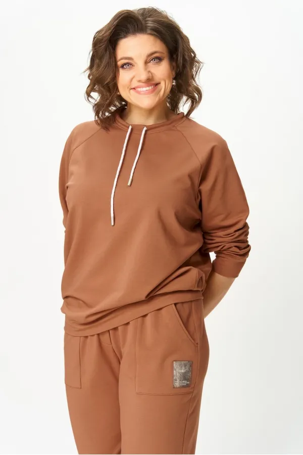 Джемпер женский из трикотажной хлопковой ткани (двунитка). Рукав реглан. Низ рукава обработан притачной манжетой. Низ изделия оформлен притачным поясом. На спинке настрочен декоративный элемент. Вырез горловины круглый, обработан бейкой со шнуром.