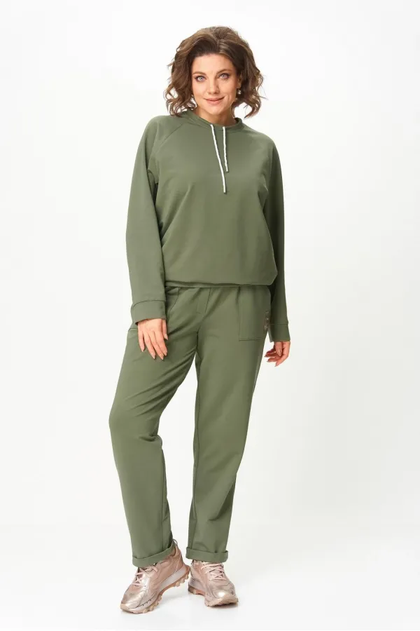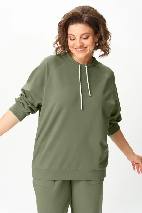 Джемпер женский из трикотажной хлопковой ткани (двунитка). Рукав реглан. Низ рукава обработан притачной манжетой. Низ изделия оформлен притачным поясом. На спинке настрочен декоративный элемент. Вырез горловины круглый, обработан бейкой со шнуром.