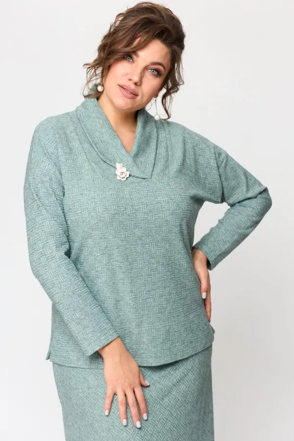 Уютный джемпер из мягкого «структурного» трикотажного полотна свободного силуэта. Воротник с глубоким запахом и складкой переходит в планку на груди. Рукав зауженный длинный. По бокам невысокие разрезы. На воротнике декоративная брошь.