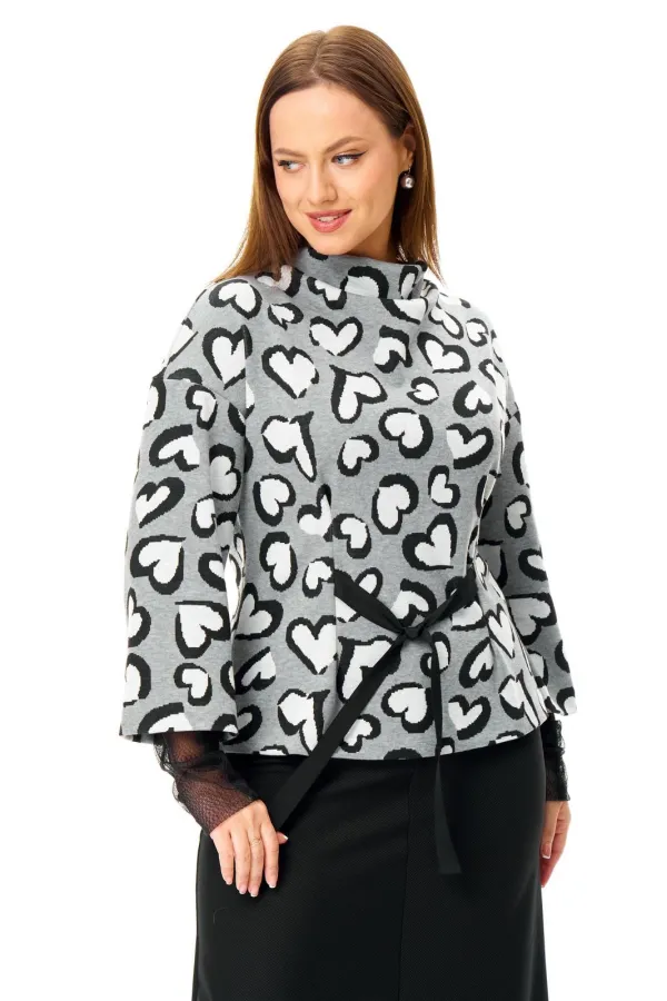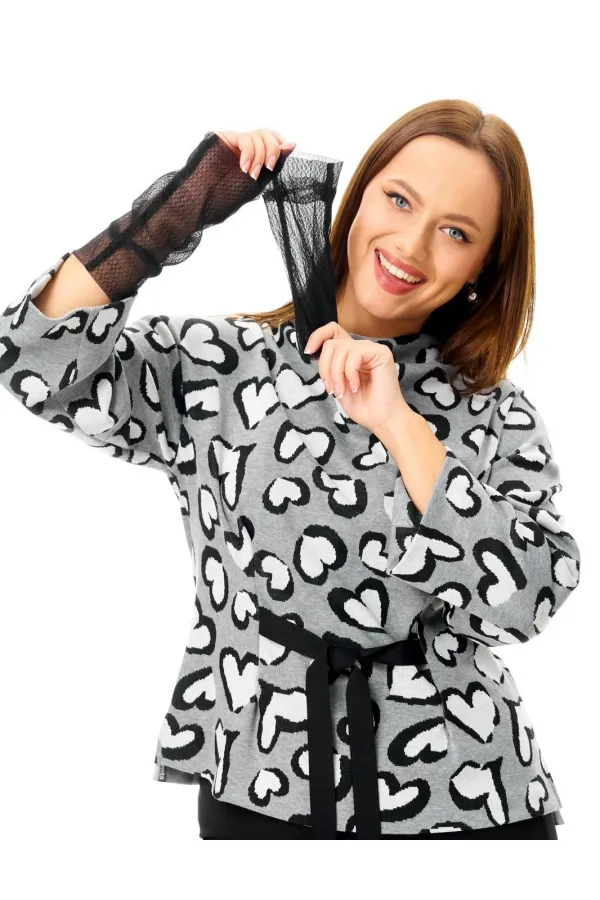 Джемпер полуприлегающего силуэта из качественного турецкого трикотажного полотна с актуальным дизайном «сердечки». Горловина цельная «стойка». Плечо спущено. Рукав 3/4. По переду притален складками, а так же есть возможность затянуть талию лентами, завязав их по переду. Низ джемпера разноуровневый: спинка длиннее переда. Съемные манжеты из «сетки».