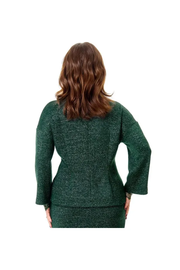 Джемпер, манжеты. Цвет изумруд с серебристым блеском. Джемпер из однотонного трикотажного полотна с блеском «люрекс». Горловина цельная «стойка». Плечо спущено. Рукав 3/4. По переду притален складками. Спинка длинн... Читать далее...