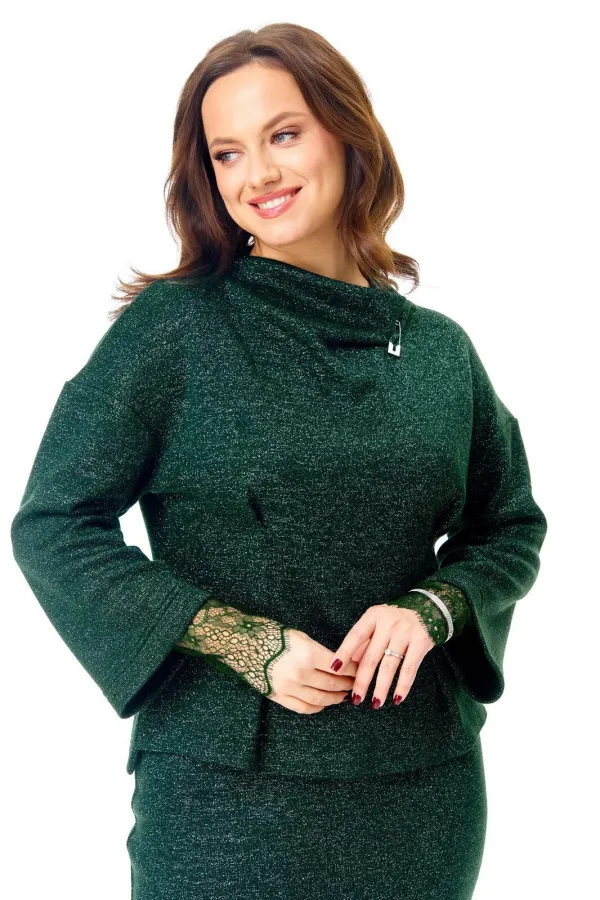 Джемпер из однотонного трикотажного полотна с блеском «люрекс». Горловина цельная «стойка». Плечо спущено. Рукав 3/4. По переду притален складками. Спинка длиннее переда. Съемные кружевные манжеты добавляют страсти образу. Стильная булавка убережет от сглаза.