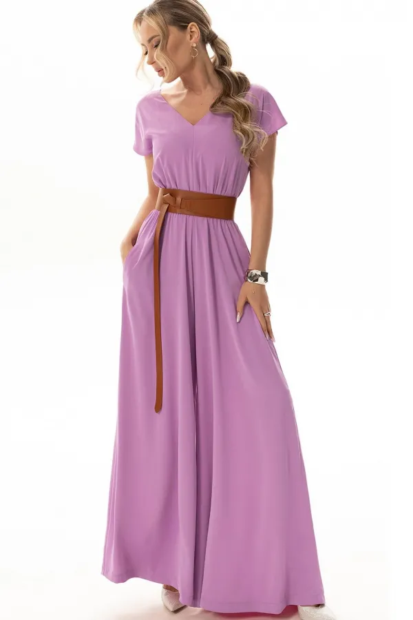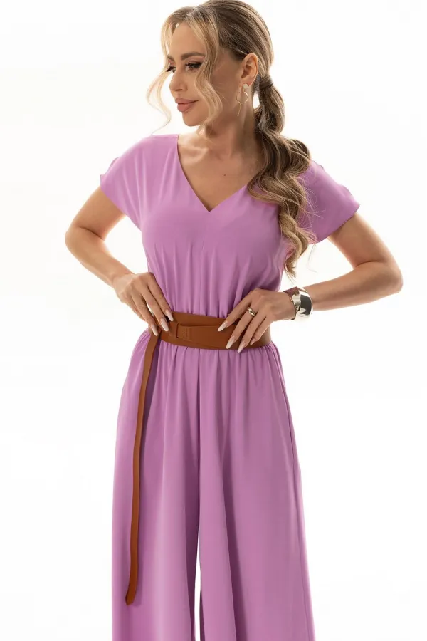 Комбинезон с центральной застежкой на потайную молнию в среднем шве спинки, без воротника, с V-образным вырезом горловины. В боковых швах расположены карманы. Комбинезон без рукавов, со спущенным плечом, разрезом по плечевому шву. Комбинезон отрезной по линии талии, шов по талии присборен на резинку. Комбинезон со съемным поясом.