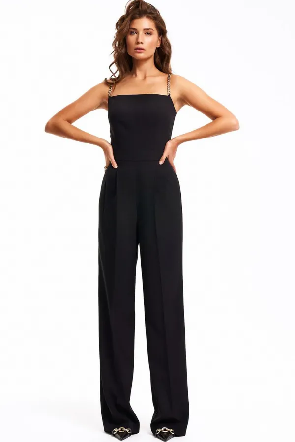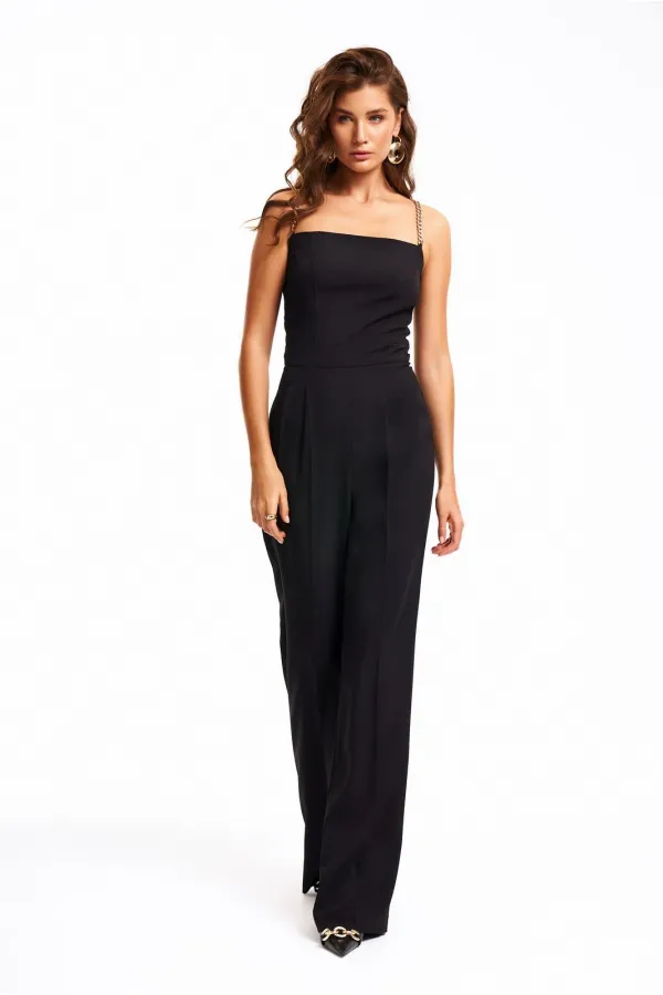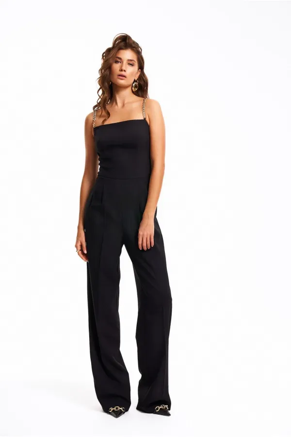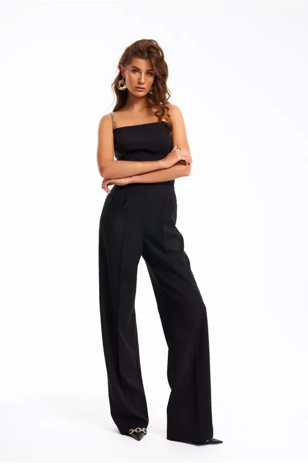 Нарядный комбинезон на бретелях из золотых цепочек. Верх изделия выполнен в виде корсета, брюки прямые от бедра с заложенной складкой по талии и заутюженным защипом. Застёжка на потайную молнию в боковом шве. Длина брюк комбинезона - 116 см