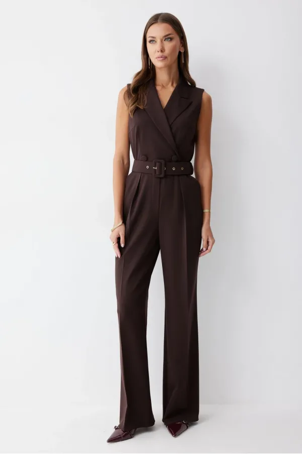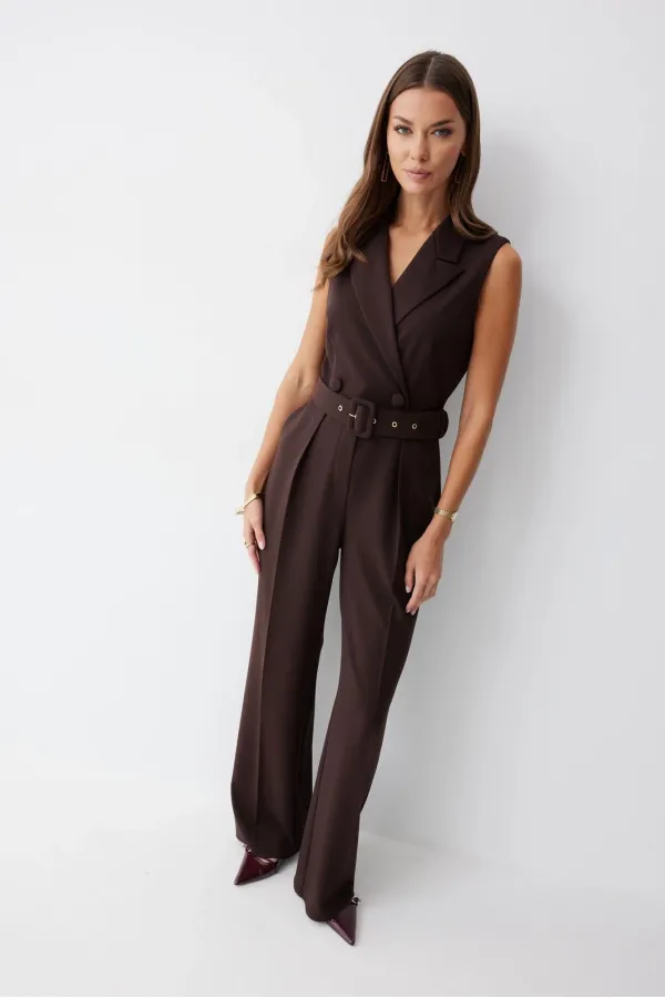 Комбинезон полуприлегающего силуэта из костюмной ткани. Воротник пиджачного типа. Комбинезон отрезной по линии талии, верхняя часть комбинезона на запах. На спинке в среднем шве застежка на потайную молнию. В боковых швах карманы. По переду на лифе талиевые и нагрудные вытачки, на брюках декоративные складки. На спинке лифа талиевые вытачки. В комплект входит ремень. Обращаем ваше внимание, что фурнитура может отличаться от фото.