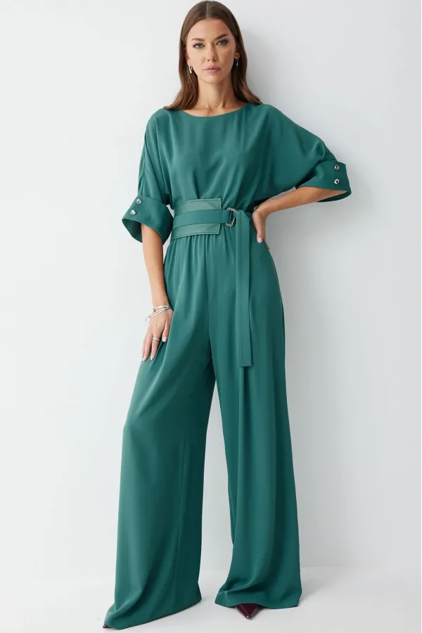 Комбинезон полуприлегающего силуэта, из струящейся ткани. Брюки прямого силуэта, со складками по переду. Комбинезон отрезной, по линии талии на резинке. Рукав цельнокроеный на манжете, длиной до локтя. Горловина округлая. В комплект входит пояс скомбинированный из экокожи и основной ткани. Обращаем ваше внимание, что фурнитура может незначительно отличаться от фото.