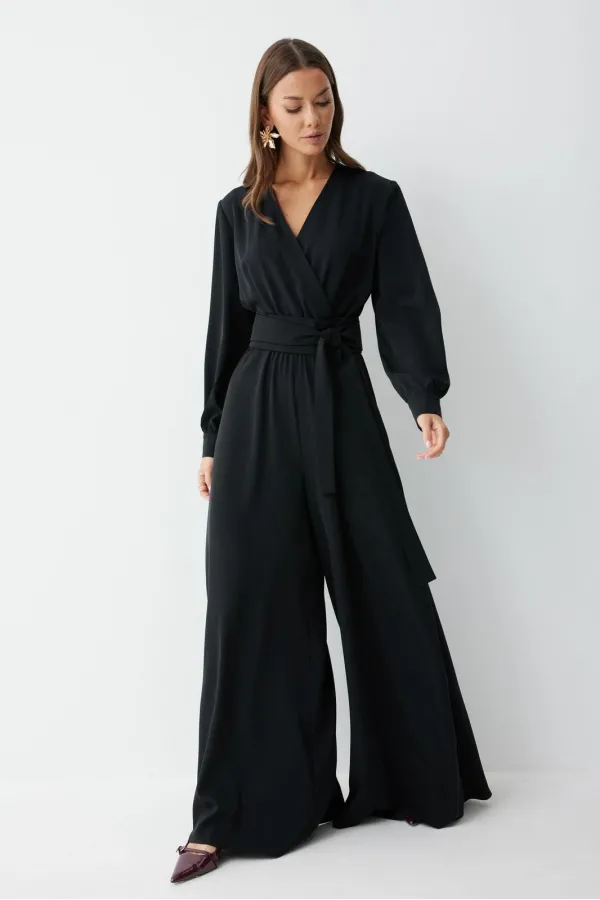 Комбинезон полуприлегающего силуэта с расширенными книзу брюками из струящейся ткани. Комбинезон отрезной по линии талии на резинке, верхняя часть комбинезона на запах. Рукав втачной, длинный, по низу манжета с застежкой на петлю и пуговицу. На спинке в среднем шве застежка на потайную молнию. В боковых швах карманы. В комплект входит пояс. Обращаем ваше внимание, что фурнитура может отличаться от фото.