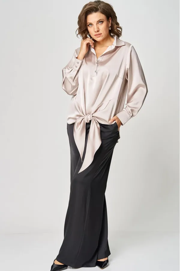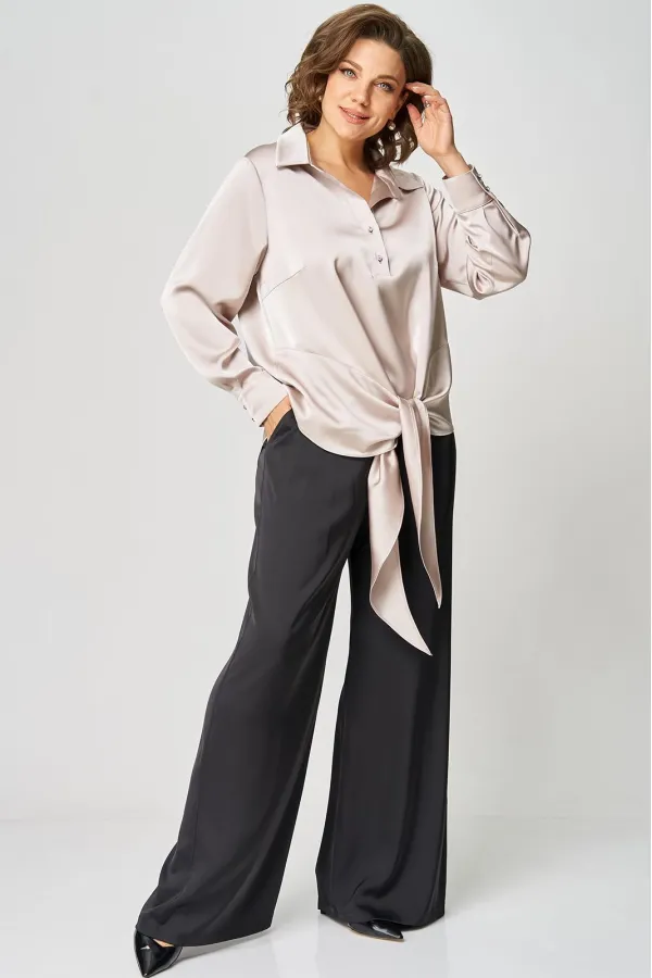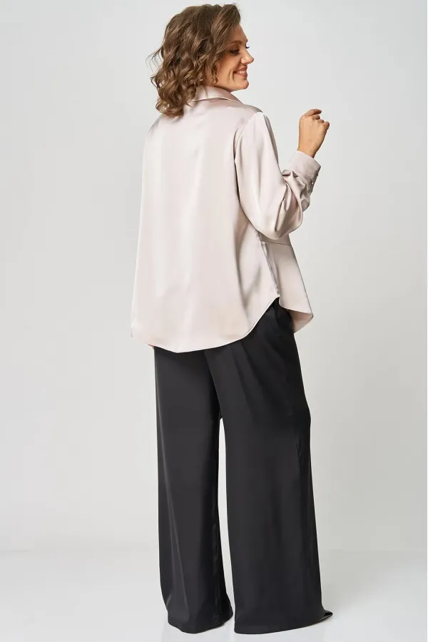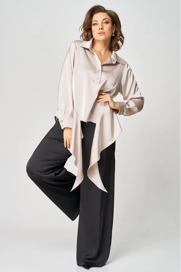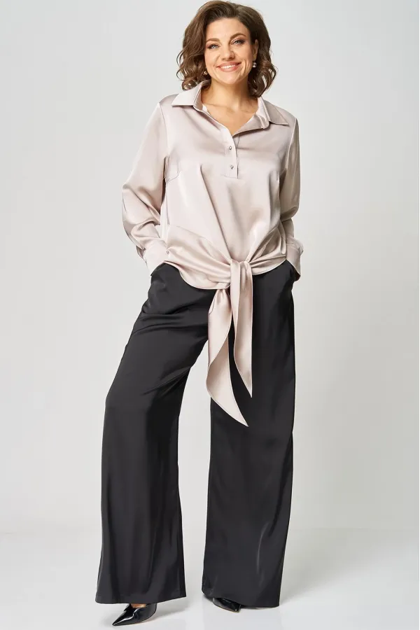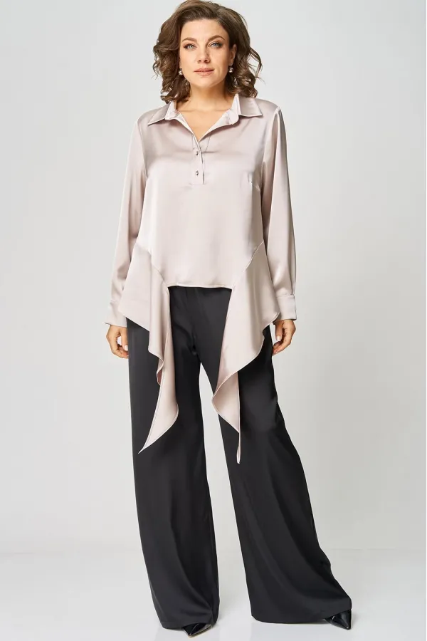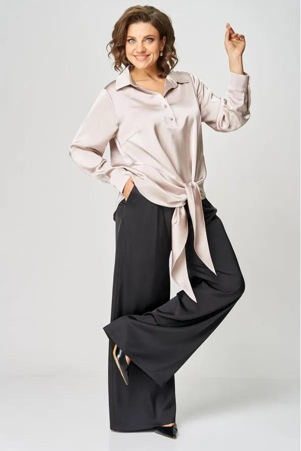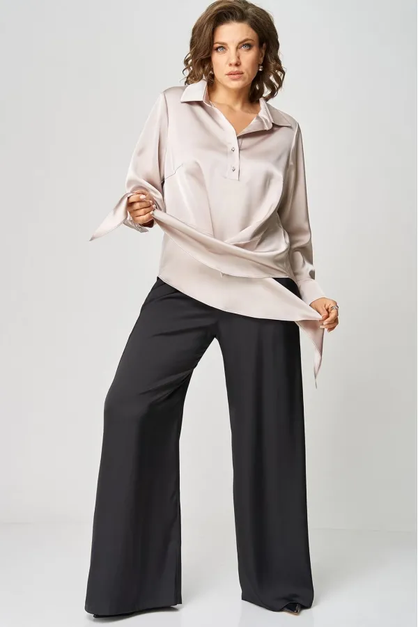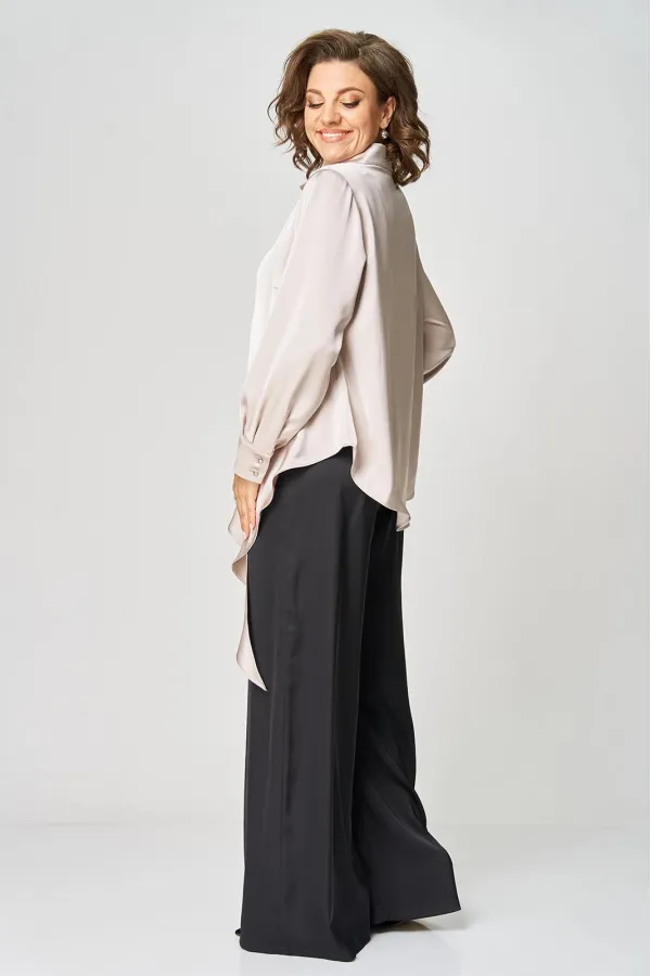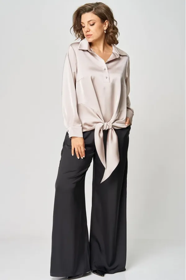 Роскошная двойка состоит из невероятно оригинальной блузки и брюк - палаццо. Наша блузка свободного силуэта средней длины, дополнена планкой по переду. Рукава втачные с естественным положением плеча на манжете. Горловина обработана рубашечным воротником. Пикантно смотрятся на блузке декоративные передние воланы-завязки, придавая образу игривость и кокетливость.