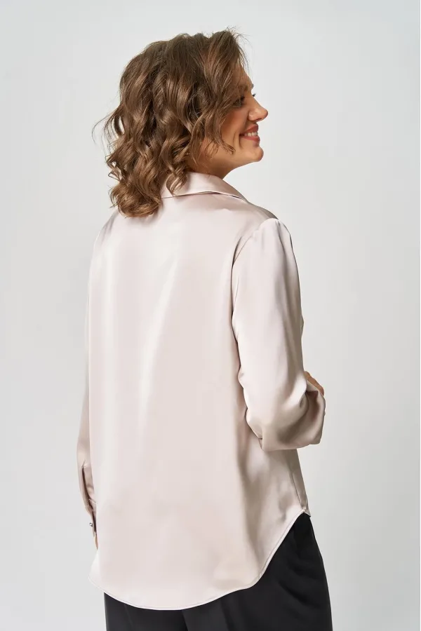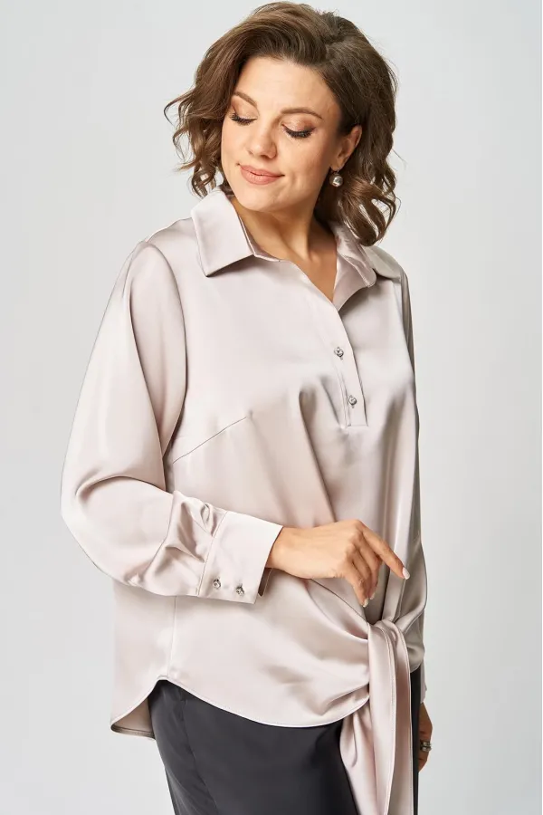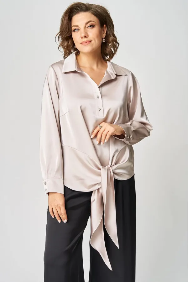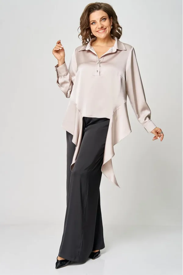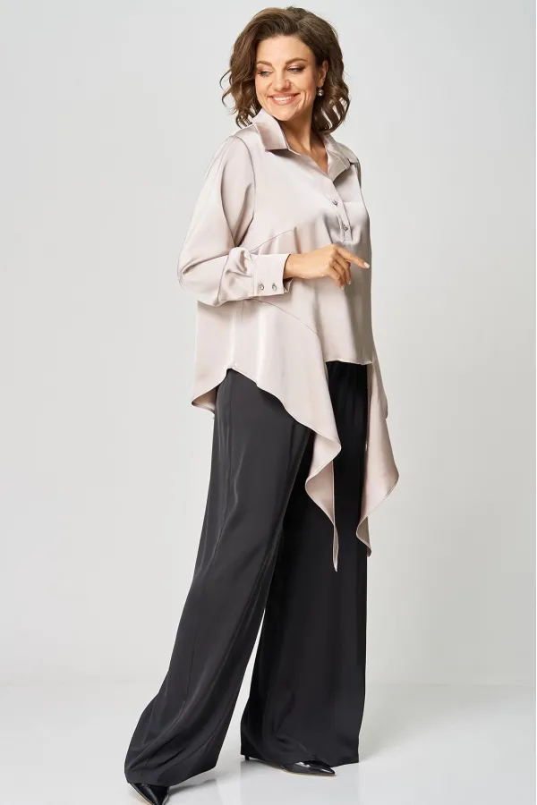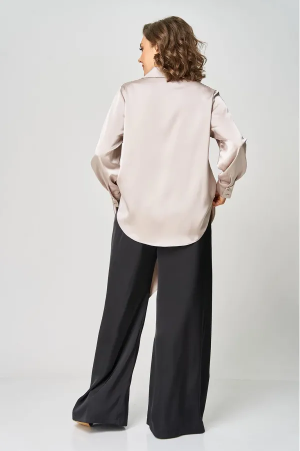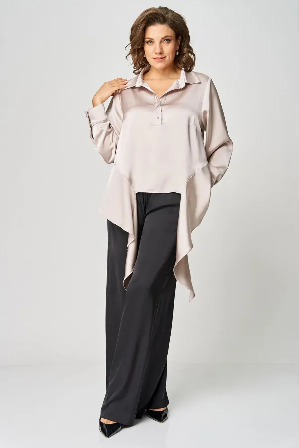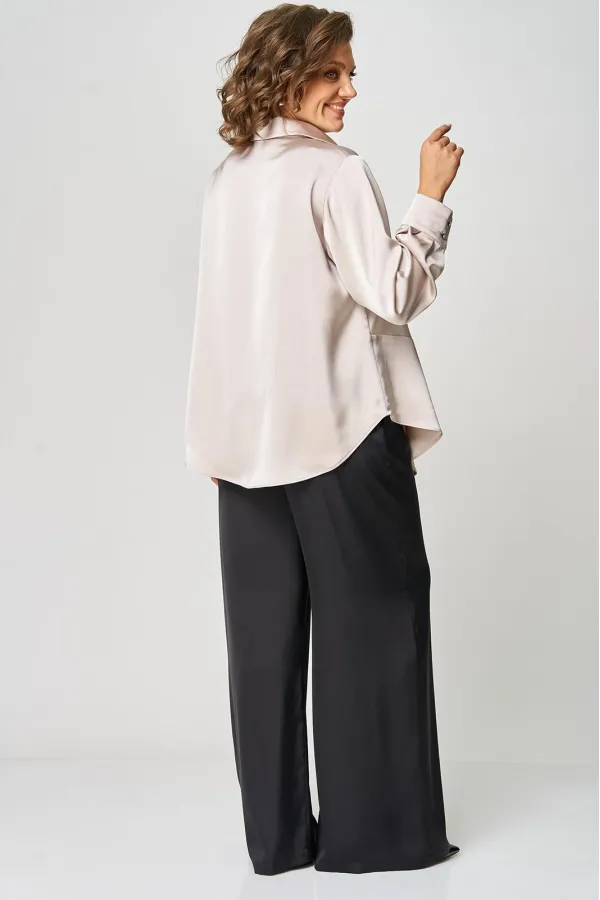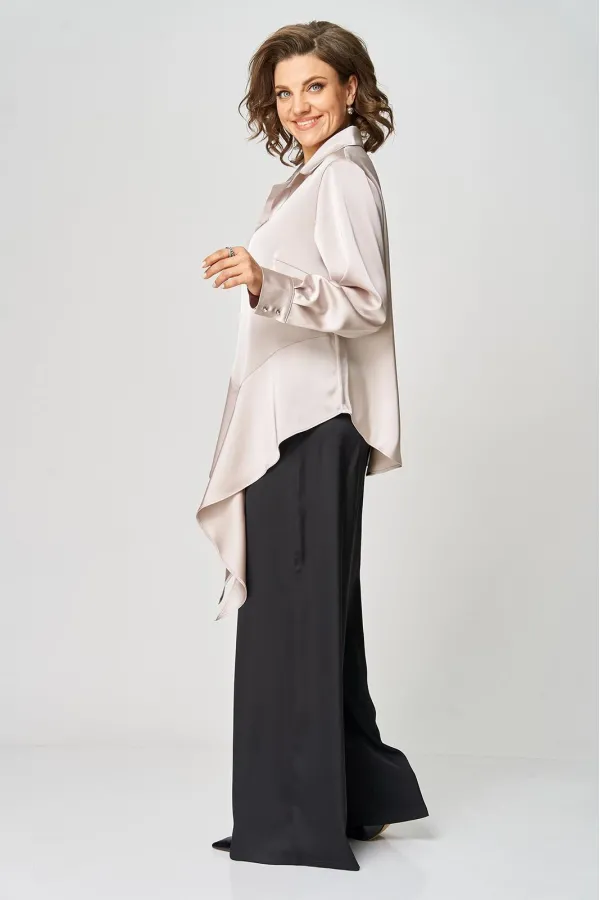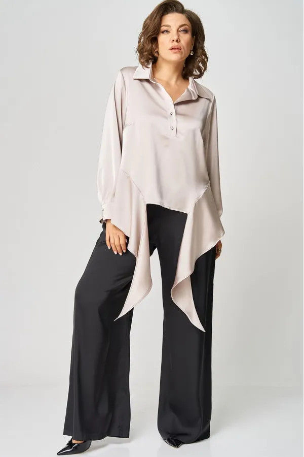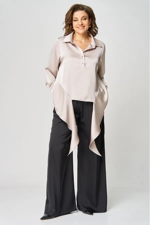 Роскошная двойка состоит из невероятно оригинальной блузки и брюк - палаццо. Наша блузка свободного силуэта средней длины, дополнена планкой по переду. Рукава втачные с естественным положением плеча на манжете. Горловина обработана рубашечным воротником. Пикантно смотрятся на блузке декоративные передние воланы-завязки, придавая образу игривость и кокетливость.