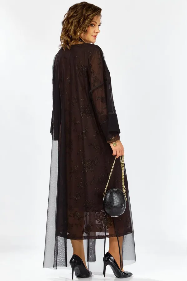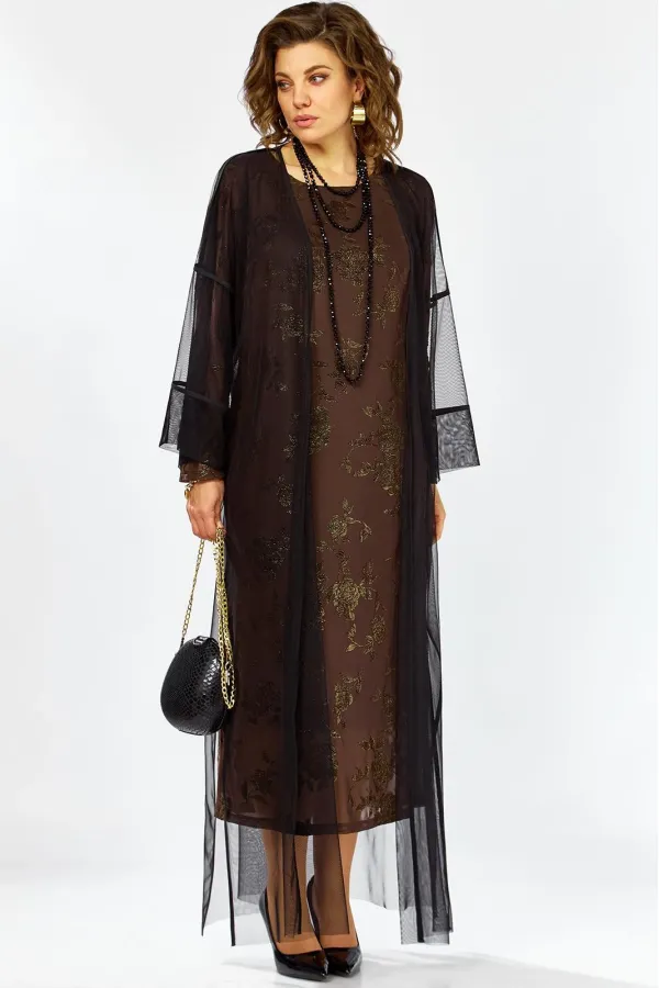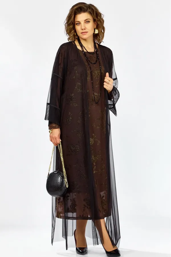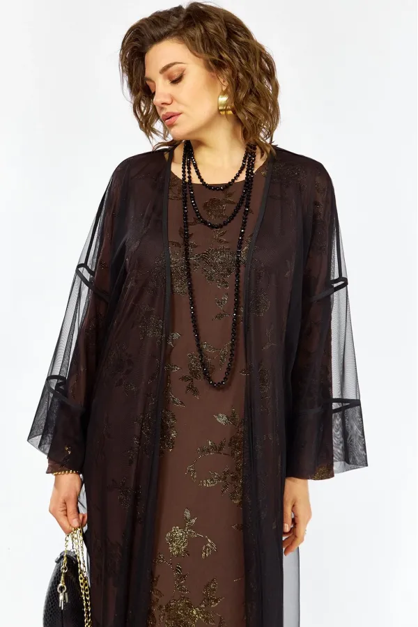 Роскошный плательный комплект. Платье на трикотажной подкладке полуприлегающего силуэта из мягкой стретч-сетки украшенной флоковым напылением с позолотой создает эффект дорогого кружевного орнамента. Образ дополняет Сверху легкая накидка кардиган-шазюбль из прозрачной сетки , она мягко драпируется , создавая воздушный легкий силуэт длинные рукава и свободный крой добавляют образу благородства и загадочности этот комплект идеально подойдёт для вечерних мероприятий торжеств и особых случаев.