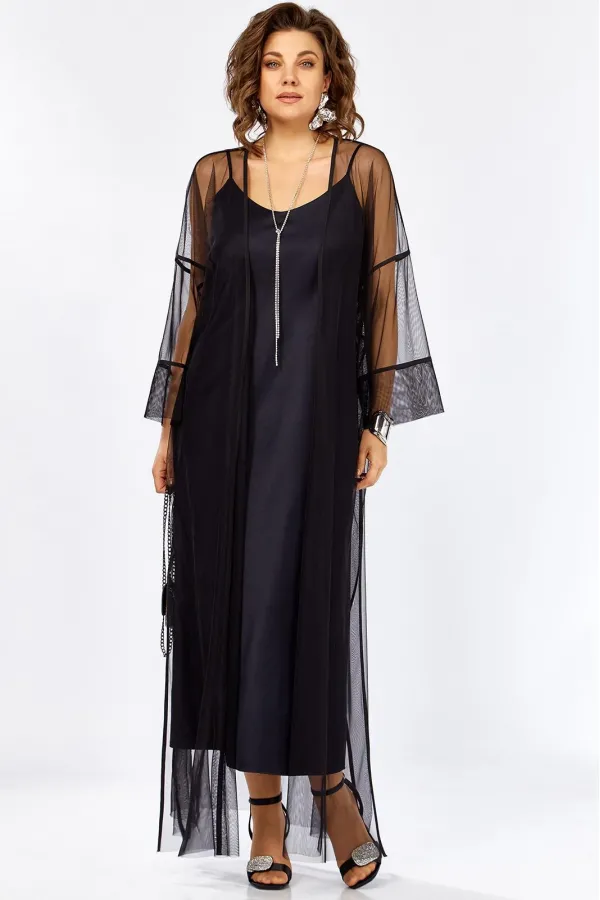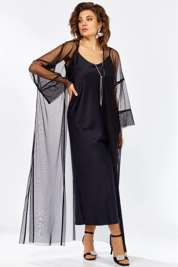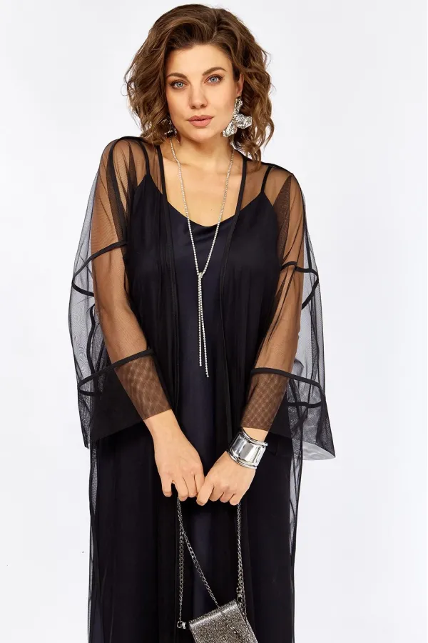 Изысканный комплект сочетает в себе платье из плотного атласа, свободного А образного силуэта , на Тонких бретелях и воздушную кардиган-шазюбль из сетки создавая образ утончённой элегантности женственности