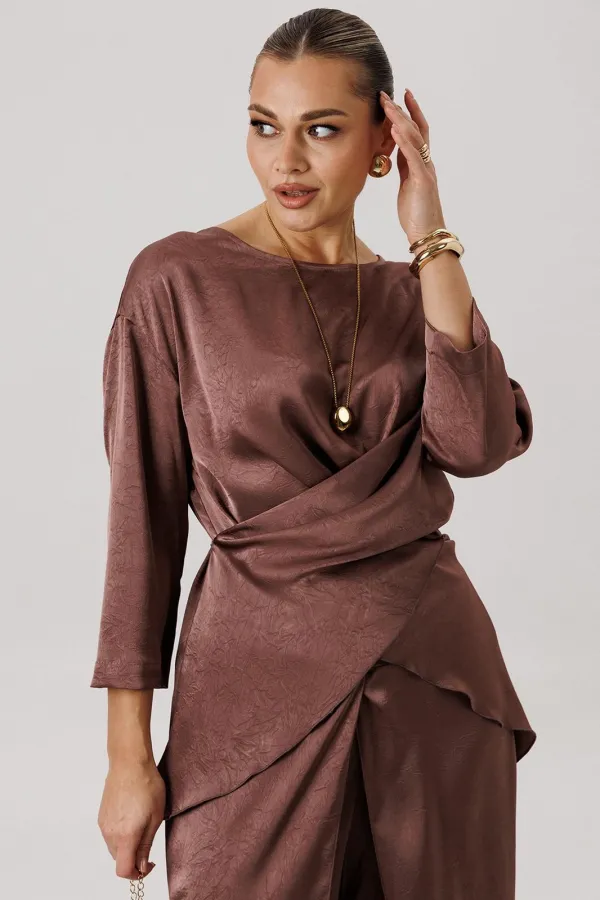 Невероятная блуза из одноимённой ткани завершает образ, превращая его в платье или даже комбинезон.