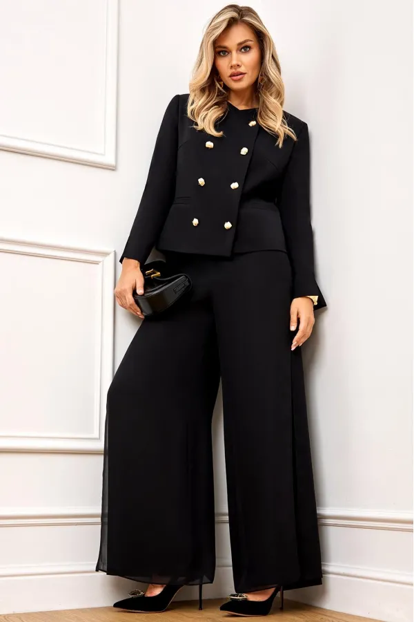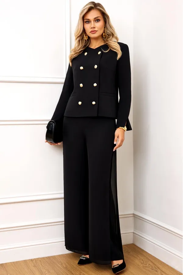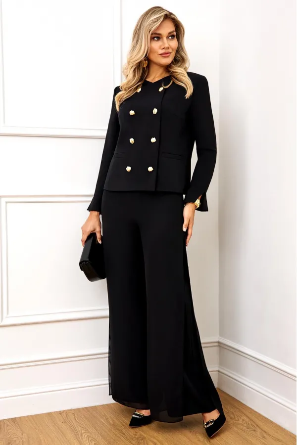 Стильный и супер эффектный костюм, состоит из жакета и брюк. Жакет полуприлегающего силуэта, выполнен из премиальной ткани Зара с добавлением вискозы. Жакет двубортный, по переду с застежкой на металлические золотые пуговицы и V-образным вырезом горловины, что придает модели особый шарм и нарядность! Жакет полностью на премиальной подкладке Grand. Рукав жакета втачной, полной длины, с небольшим разрезом по низу! Брюки — это отдельный вид искусства! Брюки прямого силуэта, выполнены из ткани Зара с добавлением вискозы, верхний слой брюк выполнен из летящего шифона, что придает модели особый стиль и нарядность. Брюки сбоку с застежкой на потайную молнию и пуговицы. Модель идеально украсит праздничный образ, но в тоже время прекрасно подойдет для ежедневной носки!
