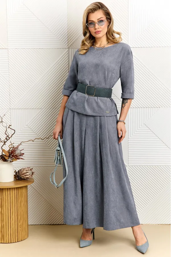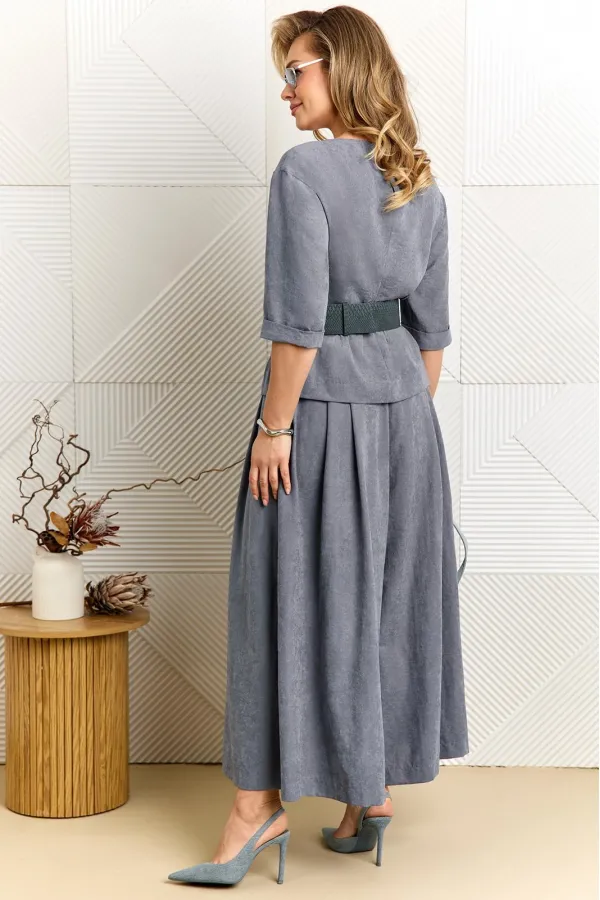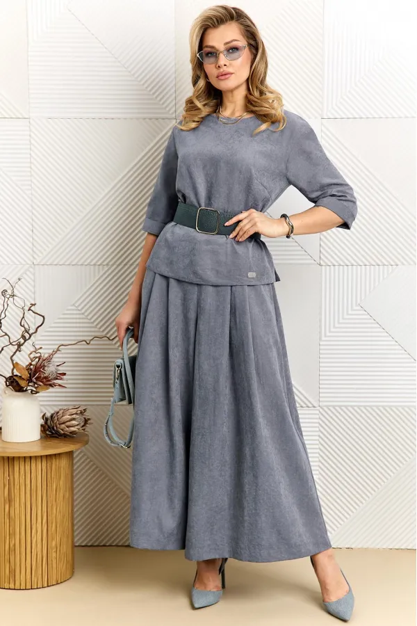 Стильный женский комплект, состоит из блузы и брюк-юбки. Блуза прямого силуэта выполнена из премиальной ткани, что придаёт изделию особый стиль. Блуза с нагрудными выточками, рукав длиной ¾, с манжетой, по бокам с небольшими разрезами (разрез 9 см). Перед блузки декорирован пришивной дизайнерской нашивкой. Брюки-юбка прямые, со складками по переду и спинке. Брюки-юбка на поясе, по бокам с резинкой, по спинке с застежкой на потайную молнию и пуговицу. В комплекте идет съемный кожаный пояс.