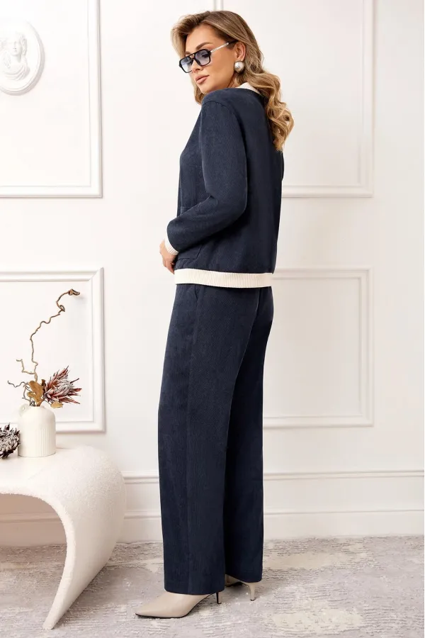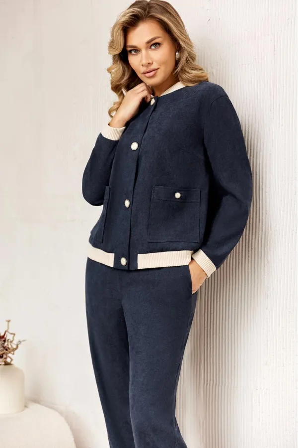 Стильный и современный комплект, состоит из бомбера и брюк. Бомбер полуприлегающего силуэта, выполнен из премиальной ткани Вельвет с добавлением вискозы. Бомбер без подкладки, по переду с застежкой на металлические пуговицы и накладными карманами с застежкой на пуговицу. Стойка горловины бомбера и манжета рукава выполнены из мягкого трикотажного довяза, что придет модели особый стиль и комфорт при носке. Рукав втачной, полной длины. Брюки прямые, слегка зауженные к низу, выполнены из премиальной ткани Вельвет с добавлением вискозы. Пояс брюк полностью на резинке, в боковых швах функциональные карманы.