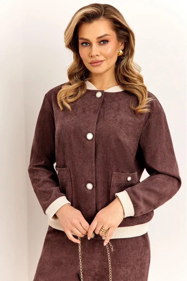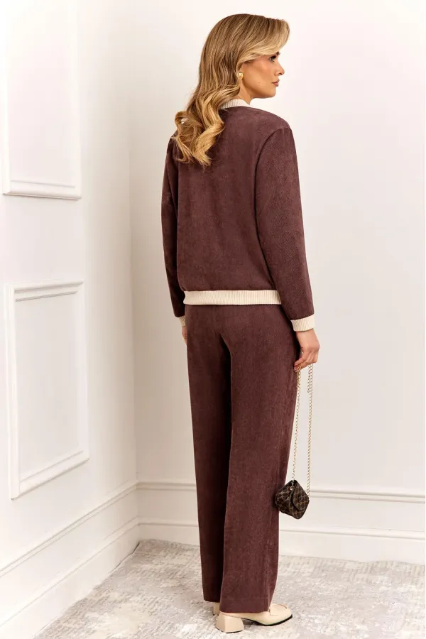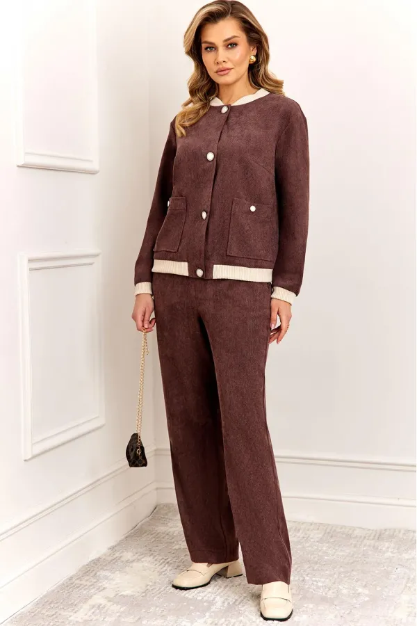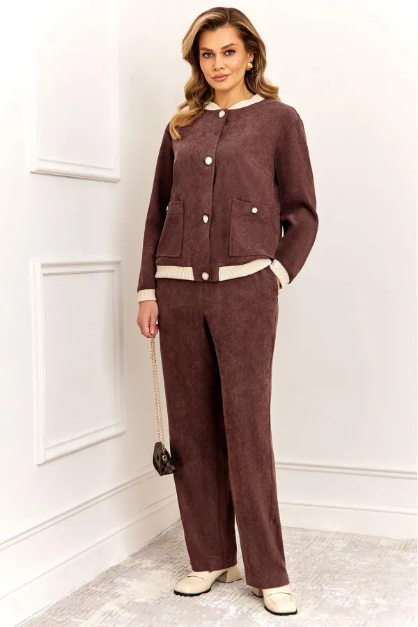 Стильный и современный комплект, состоит из бомбера и брюк. Бомбер полуприлегающего силуэта, выполнен из премиальной ткани Вельвет с добавлением вискозы. Бомбер без подкладки, по переду с застежкой на металлические пуговицы и накладными карманами с застежкой на пуговицу. Стойка горловины бомбера и манжета рукава выполнены из мягкого трикотажного довяза, что придет модели особый стиль и комфорт при носке. Рукав втачной, полной длины. Брюки прямые, слегка зауженные к низу, выполнены из премиальной ткани Вельвет с добавлением вискозы. Пояс брюк полностью на резинке, в боковых швах функциональные карманы.