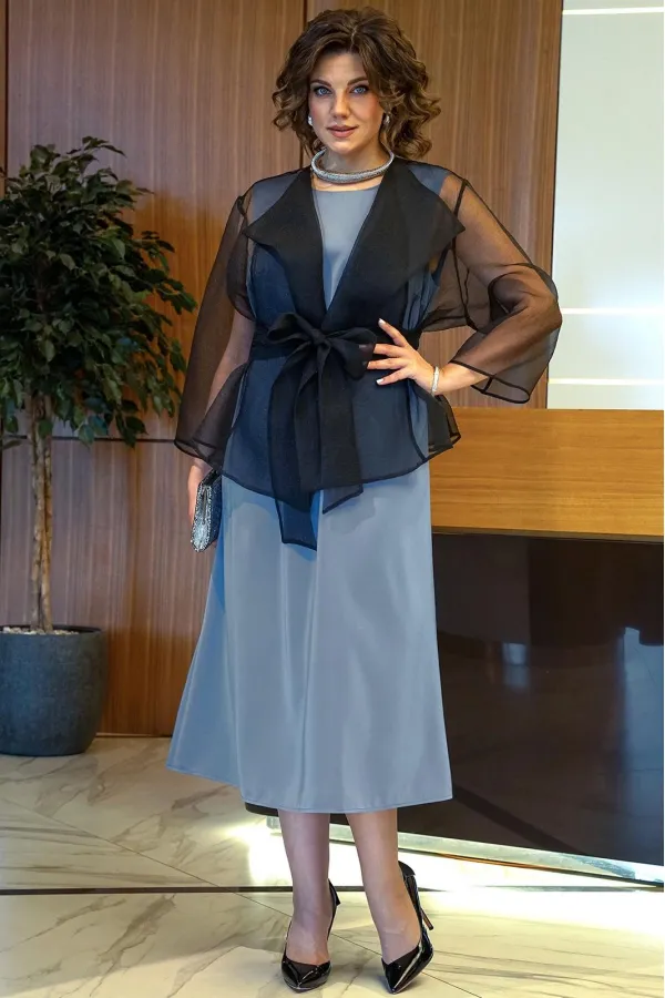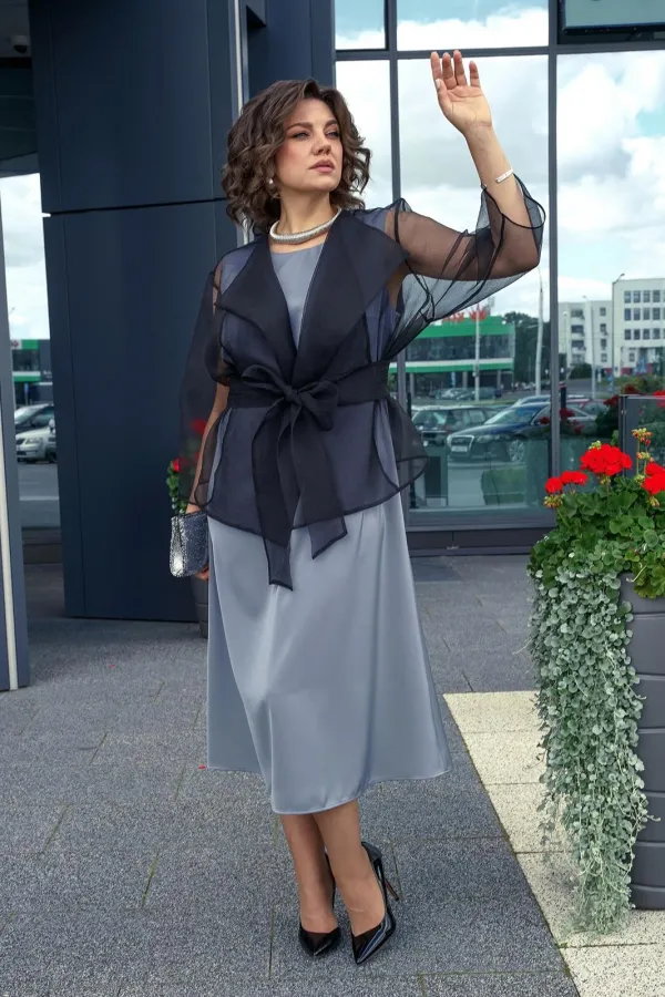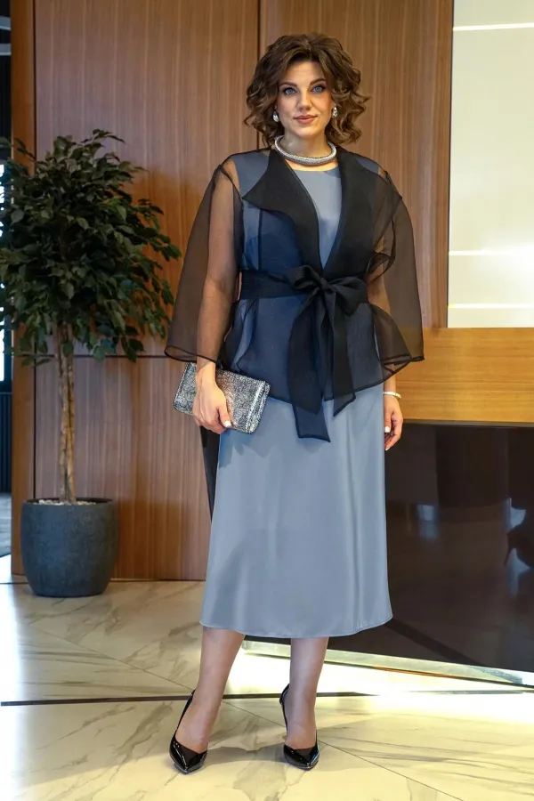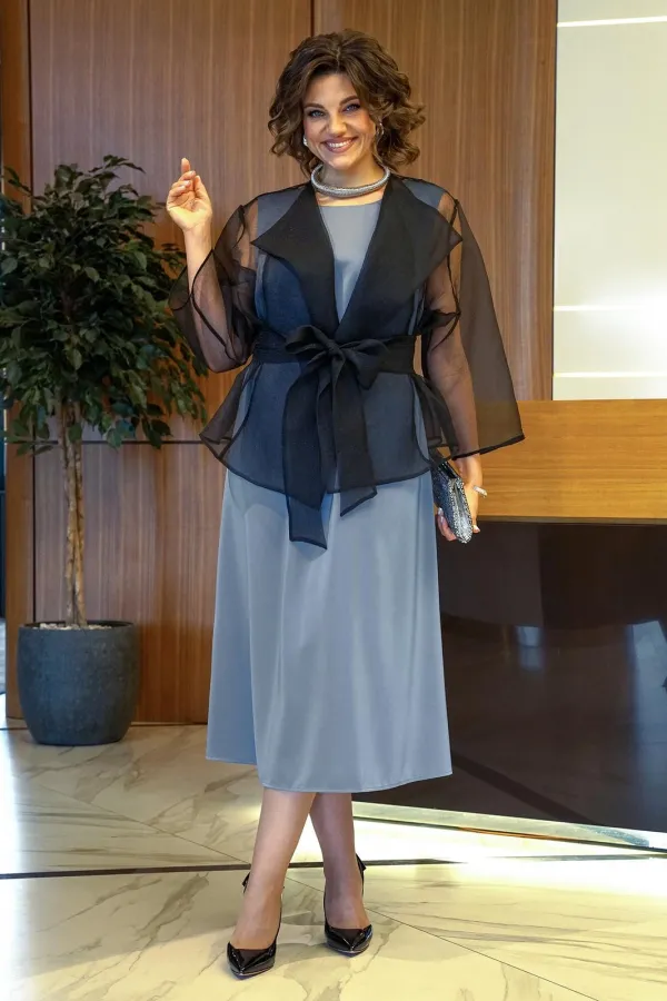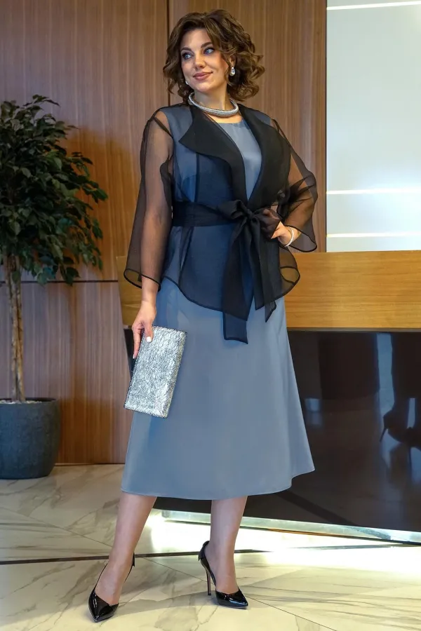 Комплект женский 2-х предметный состоит из блузона и платья.Блузон прямого, свободного силуэта, без застёжки на запах, с завязывающимся поясом. Перед с отложными лацканами. Спинка со средним швом. Рукава втачные, одношов... Читать далее...