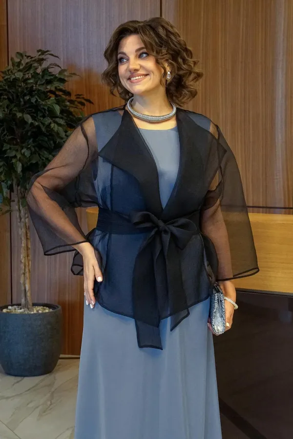 Блузон прямого, свободного силуэта, без застёжки на запах, с завязывающимся поясом. Перед с отложными лацканами. Спинка со средним швом. Рукава втачные, одношовные, длиной ¾.