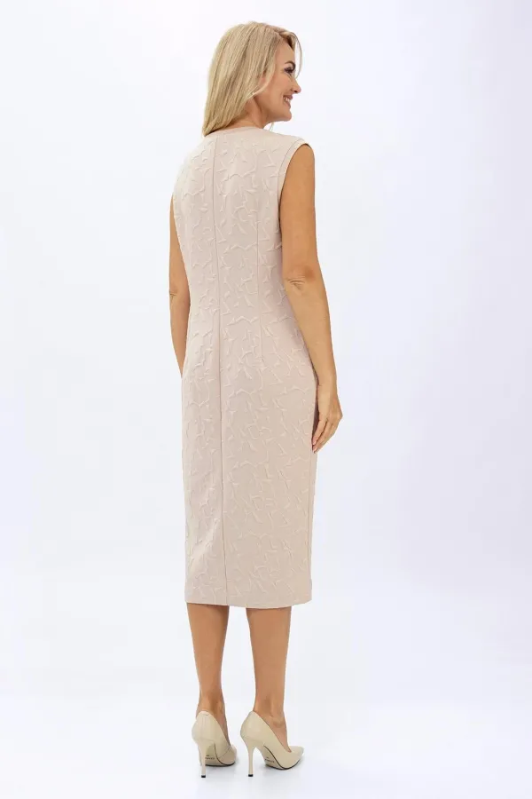 Платье полуприлегающего силуэта. По горловине и пройме бейка. Перед с нагрудными и талевыми выточками. Спинка со средним швом и талевыми выточками.
