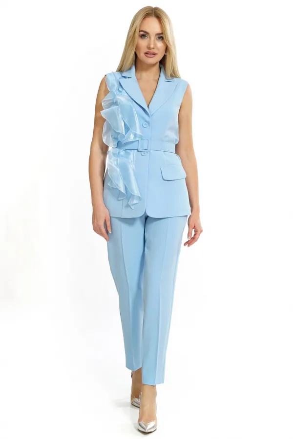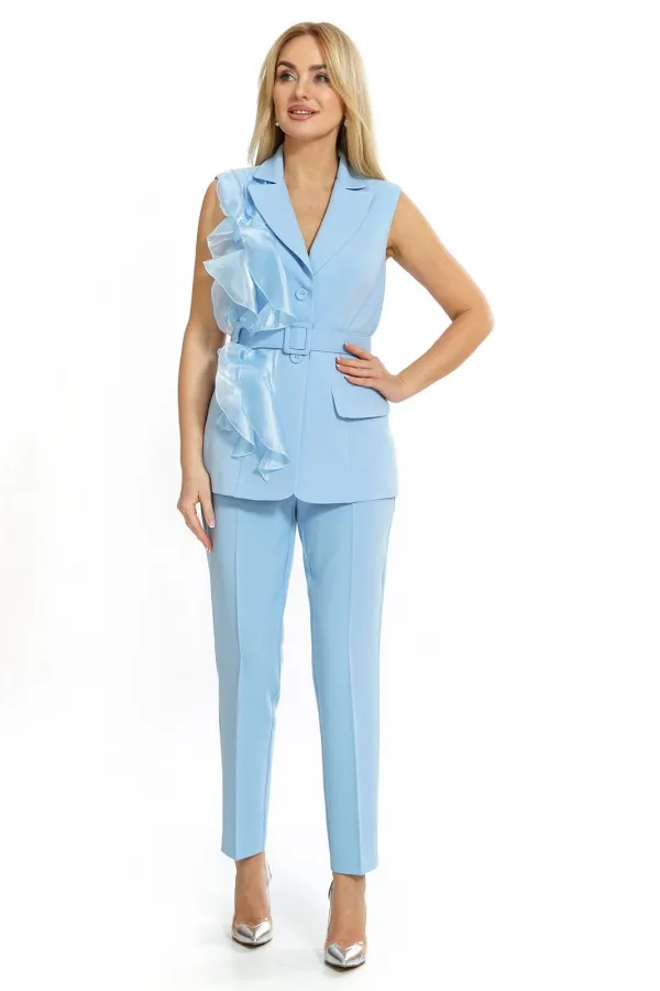 Комплект женский 2-х предметный состоит из жилета и брюк.Жилет полуприлегающего силуэта, с застёжкой на петли, пуговицы, в дополнении с ремнем. Декорированный по переду воланами (выполненные из отделочной ткани органза).... Читать далее...