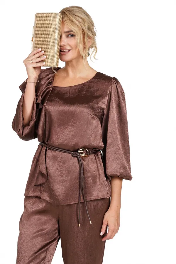 Блуза прямого силуэта, с застёжкой на потайную молнию в среднем шве спинки в дополнении ремень. Перед с нагрудными выточками и рельефным швом, декорированный воланами. Рукава на подкладке, втачные, одношовные, длиной 3/4, понизу объёмной формы, по окату и низу со сборкой.