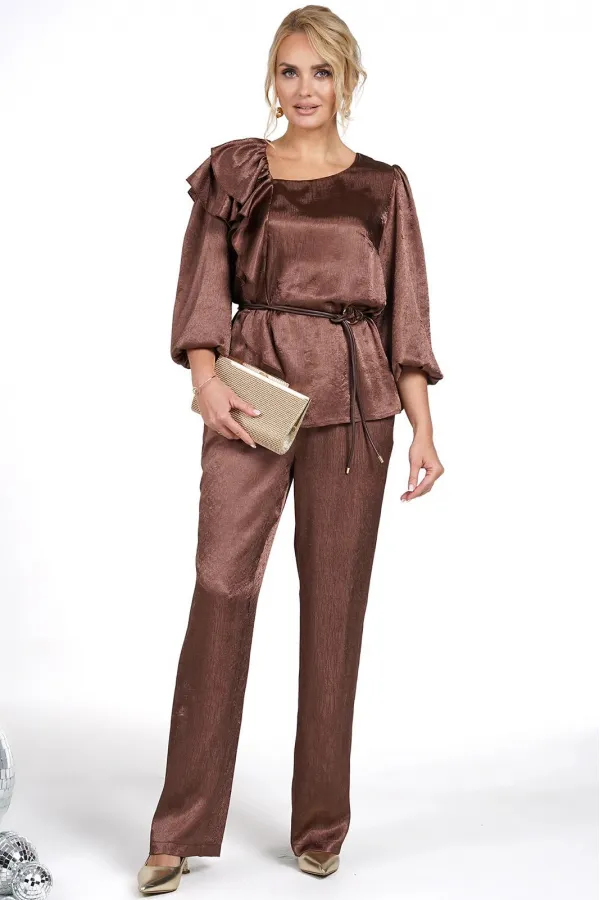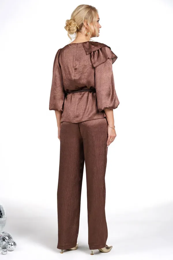 Комплект женский 2-х предметный состоит из блузы, брюк.Блуза прямого силуэта, с застёжкой на потайную молнию в среднем шве спинки в дополнении ремень. Перед с нагрудными выточками и рельефным швом, декорированный воланам... Читать далее...