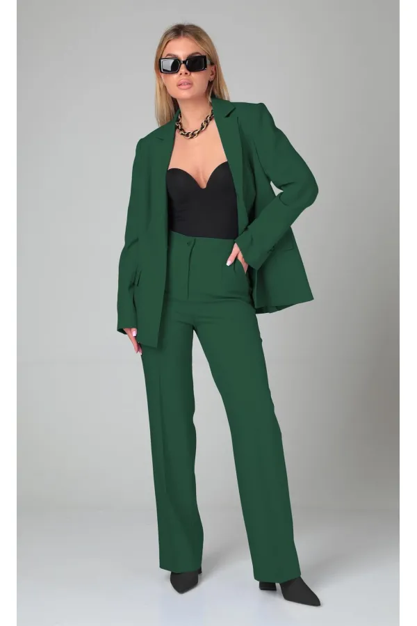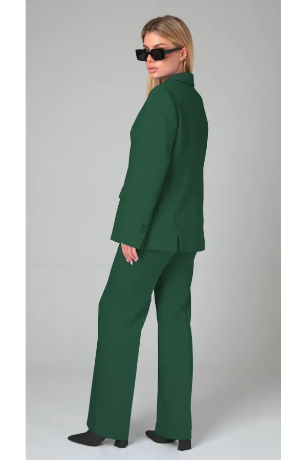 Костюм, состоящий из жакета и брюк, жакет полуприлегающего силуэта, с центральной застежкой на 3 петли и пуговицы, перед с талиевыми вытачками , отрезными бочками и карманами в рамку с клапанами, спинка со средним швом,рельефами и 2 шлицами по низу, рукава втачные двухшовные со шлицами по низу и декоративными пуговицами. Брюки прямые широкие со складками на поясе с застежкой спереди на молнию и боковыми карманами