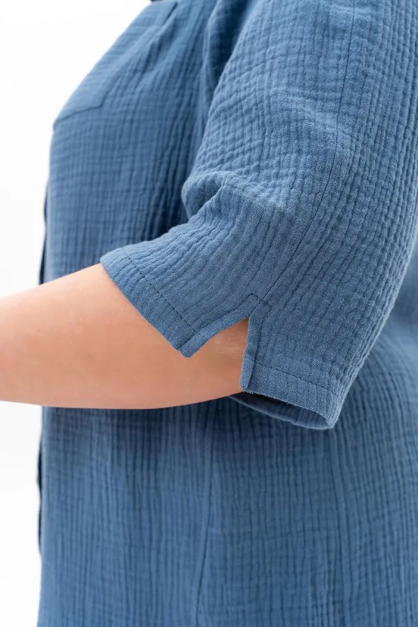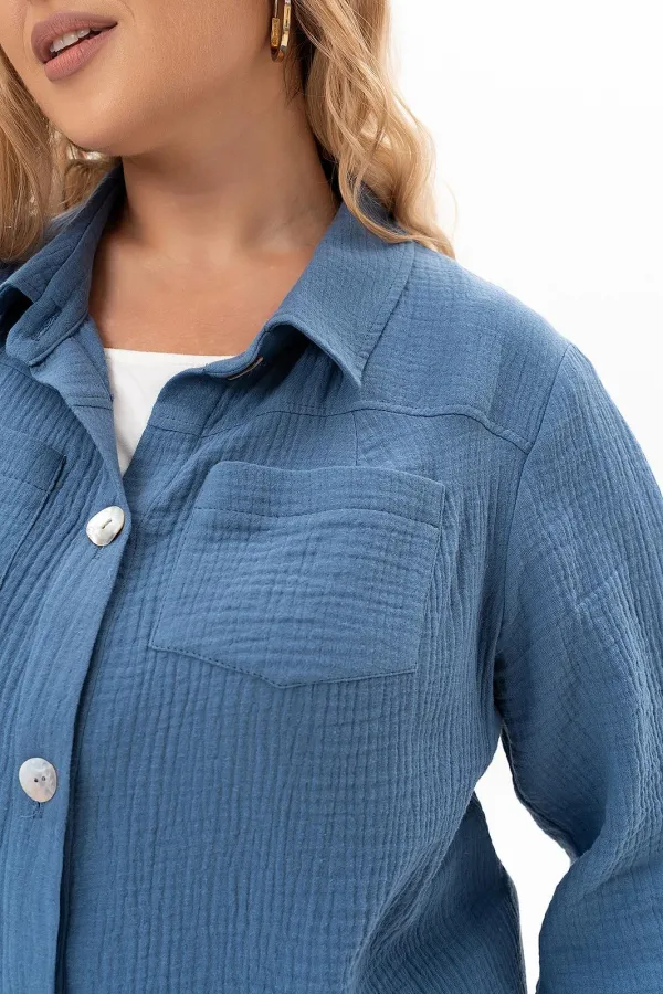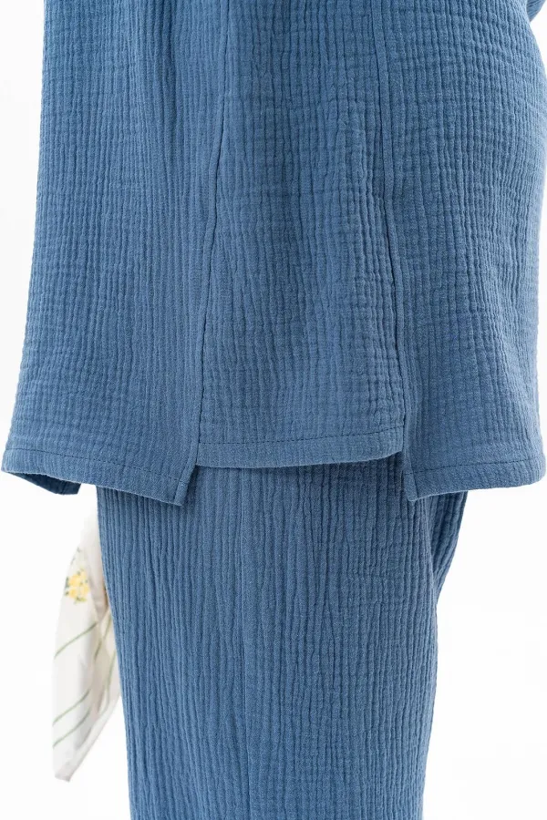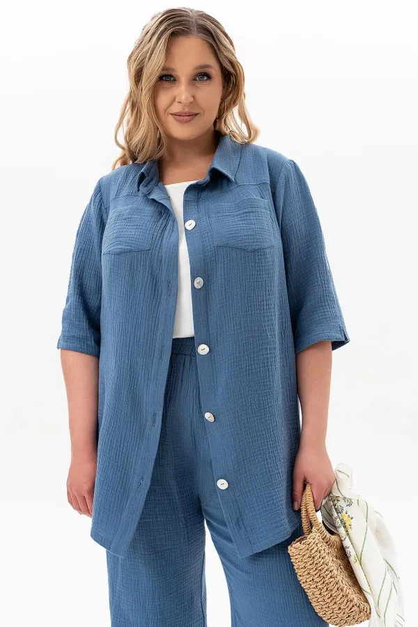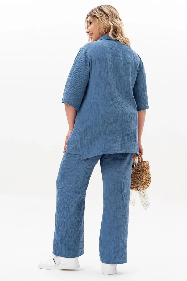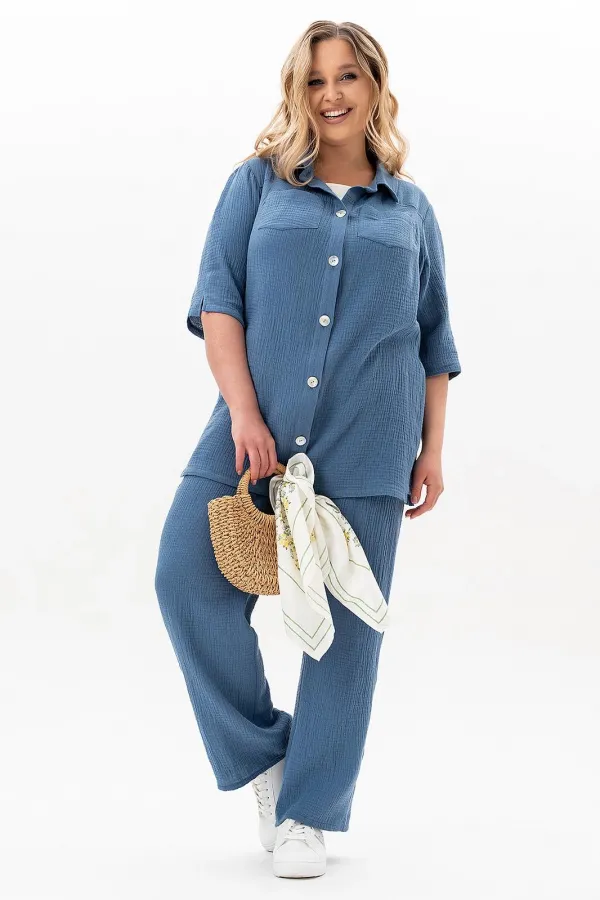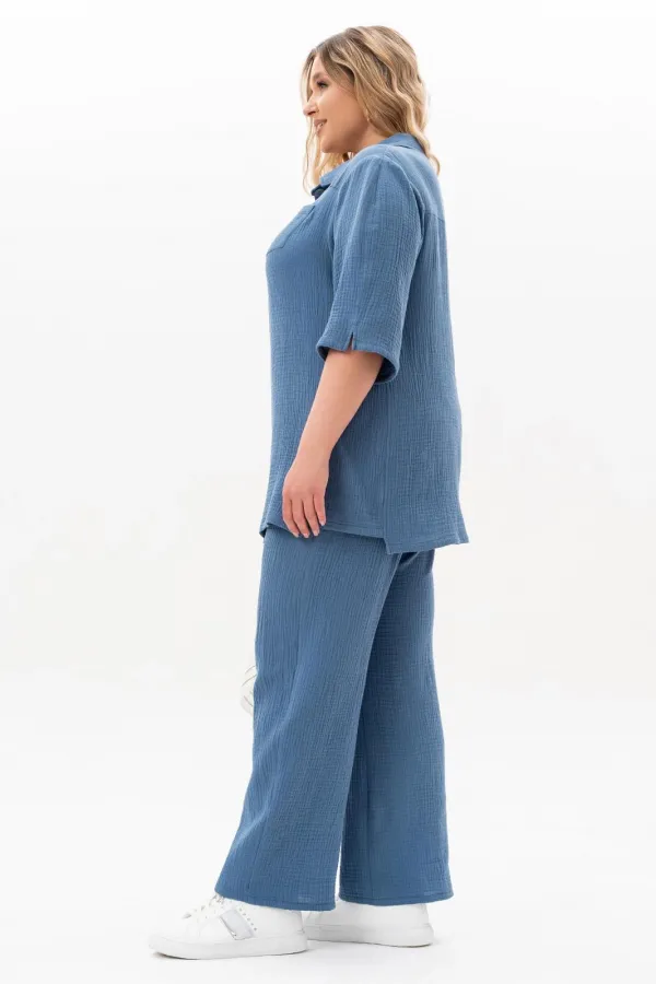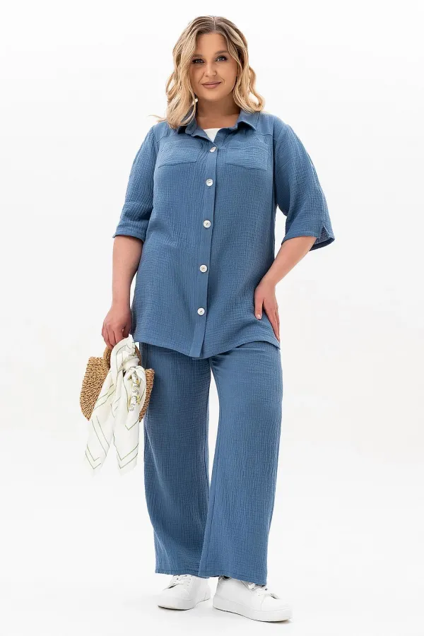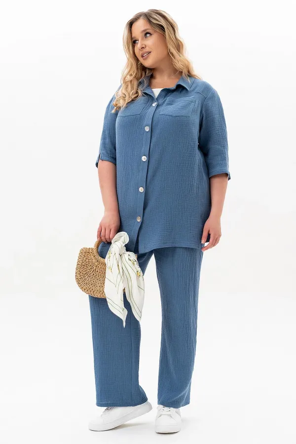 Ищете идеальный костюм, который сочетает в себе комфорт и стиль? Обратите внимание на наш женский брючный костюм из муслиновой ткани! Этот комплект станет Вашим незаменимым спутником как для домашнего отдыха, так и для прогулок на свежем воздухе. Изготовленный из 100% хлопка, он обеспечивает отличную воздухопроницаемость и легкость, что особенно актуально в жаркие летние дни. Муслин — это дышащий материал, который быстро сохнет, что делает его идеальным выбором для активных женщин. Вы сможете не беспокоиться о стирке, ведь этот комплект легко стирать и он не требует особого ухода. Костюм представлен в универсальном дизайне, который подойдет для любого повода. Стильный, яркий цвет добавит яркости в Ваш гардероб. Брюки на резинке с карманами-хулиганами в боковых швах. Силуэт брюк прямой. Рубашка дополнена накладными карманами по переду и кокетками на спинке и полочке. Перед и спинка рубашки - разноуровневые. Рукав с увеличенной линией плеча, длиной до локтя и с небольшими разрезами. На полочке пришиты пуговицы из натуральной ракушки.