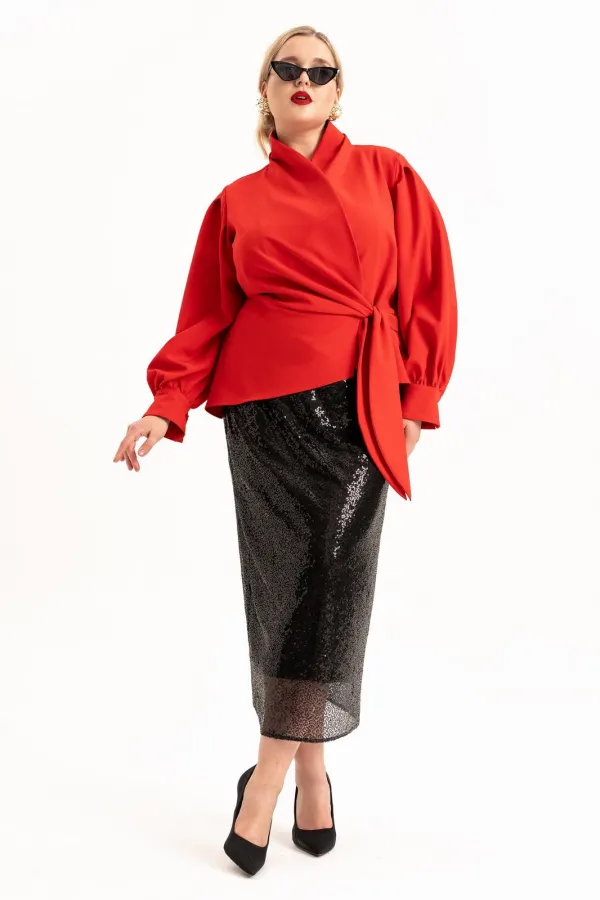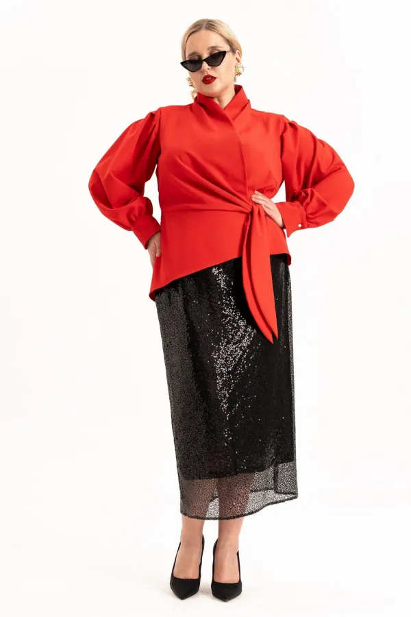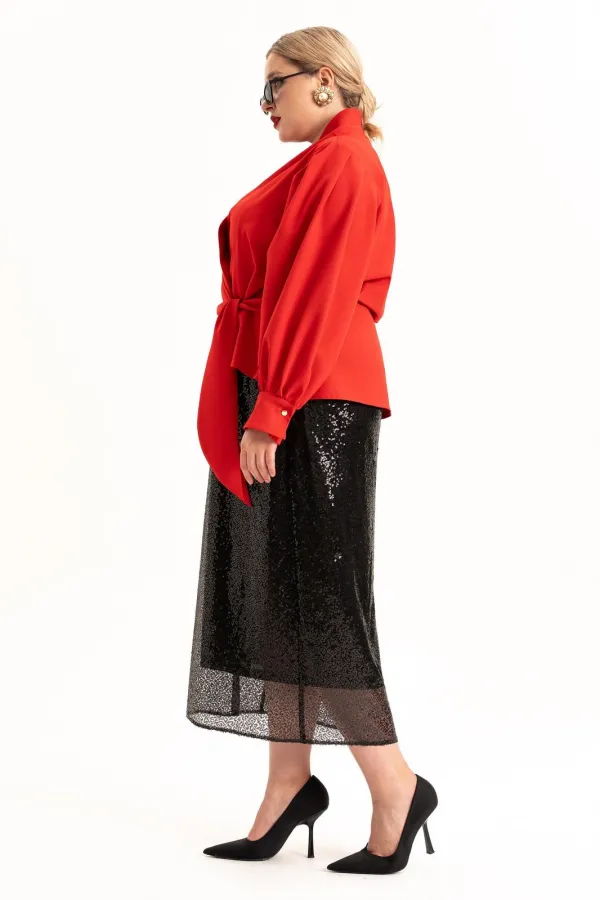 Элегантный женский костюм из ткани «марчано» и паеток на трикотажной подкладке стильный и универсальный наряд для различных мероприятий. Данный женский костюм состоит из нарядной блузы и роскошной юбки с паетками, что делает его идеальным решением для безупречного образа.На юбке обрабона потойная молния в боковом шве, пояс на резинке. Блуза с отрезной баской и воротником стойкой переходящей в борта. Застежка на потайную петлю и пуговицу и на завязки. Рукав длинный, втачной на манжете. По окату рукава обработаны складки. Благодаря универсальному дизайну, костюм можно успешно сочетать с различными элементами гардероба, создавая разнообразные стили от официального до повседневного. Стильный, роскошный, изысканный, комплект идеально подойдет для различных мероприятий. Отражает роскошь, придает элегантность и изысканность. Будет великолепно смотреться на любой фигуре и привлечет к вам внимание окружающих. Этот комплект идеальный выбор для тех, кто хочет выглядеть стильно и привлекательно на вечеринке или романтическом свидании. Сочетайте с красивыми аксессуарами и обувью на каблуке для завершения образа! Доступен в различных размерах, в том числе и для женщин пышных форм, этот костюм позволит каждой леди подобрать идеальный вариант. Красный цвет блузы и роскошная юбка из паеток подчеркнут вашу индивидуальность и хороший вкус.