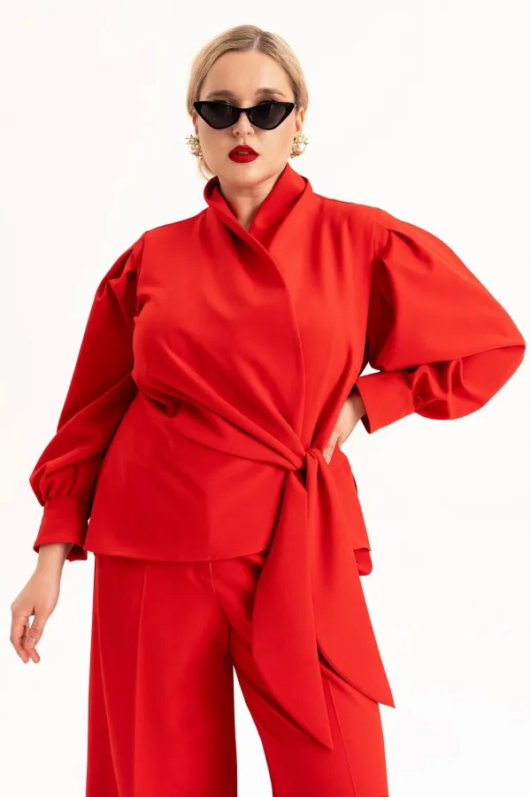 Элегантный женский костюм из ткани «марчано» стильный и универсальный наряд для различных мероприятий. Модель двойка сочетает в себе современные тенденции 2025-26 года с классическими акцентами. Подходит как для офиса, так и для особых случаев ( новый год, корпоративы, свадьбы или дни рождения) обеспечивая комфорт и уверенность в себе. Брюки с широкими штанинами палаццо выгодно подчеркивают женственные формы, а свободный крой обеспечивает удобство в любой ситуации. Этот костюм больших размеров идеально подойдет для прохладного времени года благодаря легкому материалу и возможности сохранить тепло. Текстура ткани добавляет изысканности и роскоши, делая образ особенно привлекательным на особых событиях. Благодаря универсальному дизайну, костюм можно успешно сочетать с различными элементами гардероба, создавая разнообразные стили от официального до повседневного. На брюках обработаны карманы в боковых швах, по талии пояс с застежкой на молнию и частично на резинке. Жакет с отрезной баской и воротником стойкой переходящей в борта. Застежка на потайную петлю и пуговицу и на завязки. Рукав длинный, втачной на манжете. По окату рукава обработаны складки. Доступен в различных размерах, в том числе и для женщин пышных форм, этот костюм позволит каждой леди подобрать идеальный вариант. Красный цвет костюма подчеркнут вашу индивидуальность и хороший вкус. Независимо от того, выберите ли вы его для офиса или вечера, этот костюм станет верным спутником в создании вашего стильного образа.