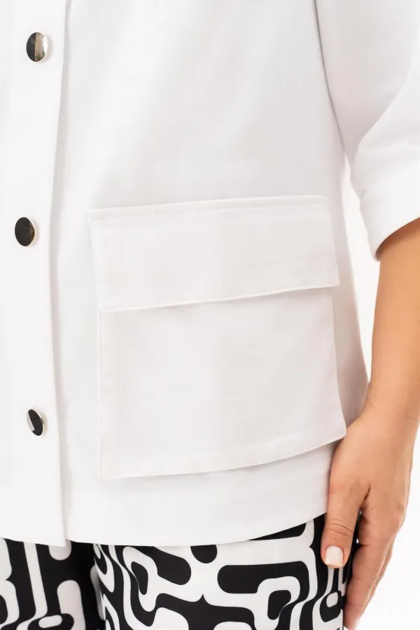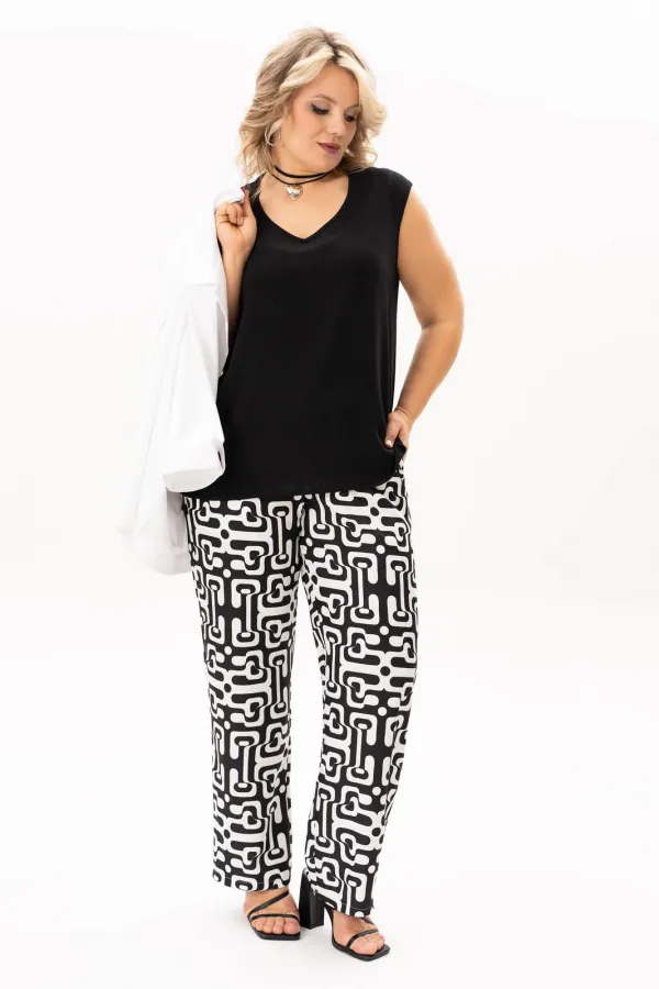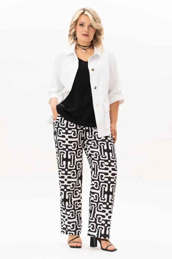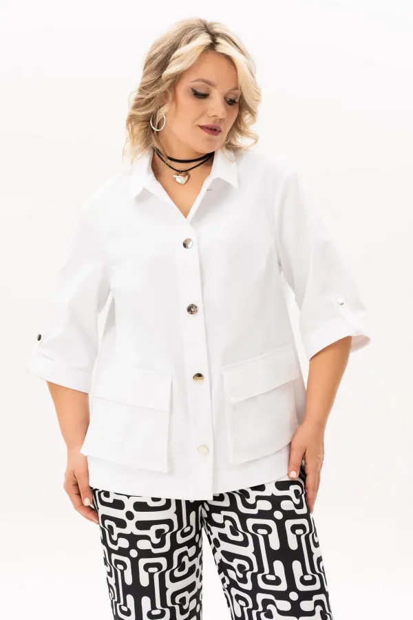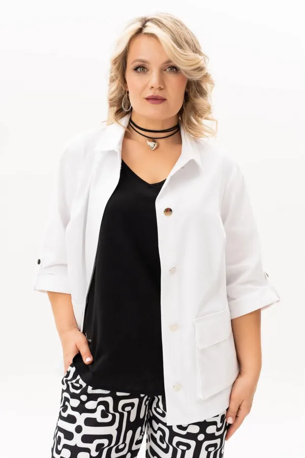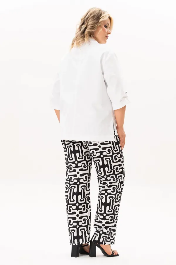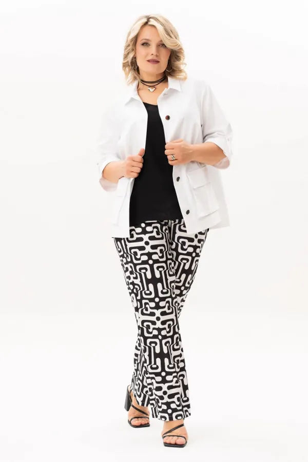 Стильный, современный, трендовый комплект с джинсовой курточкой , брюками и блузв для повседневной носки, торжественного мероприятия, в офис, школу или на прогулку. Приобретая один комплект, Вы покупаете несколько образов, каждая единица которого универсальна, поэтому может сочетаться со многими вещами из Вашего гардероба. Стильный вариант для красивого женского образа – сочетание белого джинсового жакета с брюками прямого кроя из принтованной ткани и контрастной майкой. Жакет-куртка прямого кроя с рельефными швами и кокетками по переду и спинке. Накладные карманы с клапанами и декоративные металлизированные пуговицы - узнаваемые нотки вневременной джинсовой мелодии. В рукавах предусмотрены паты с пуговицей, что позволяет сделать рукава короче. Жакет просто необходим при создании как романтического, так и спортивного образа. Майка с рукавом «крылышко», горловина углубленная V-образной формы. Брюки прямого кроя с боковыми карманами и поясом частично на резинке. Не упустите возможность приобрести брючный комплект с большим выбором размеров и ощутить комфорт в носке качественной и стильной одежды!