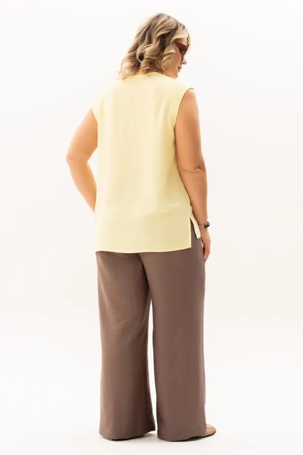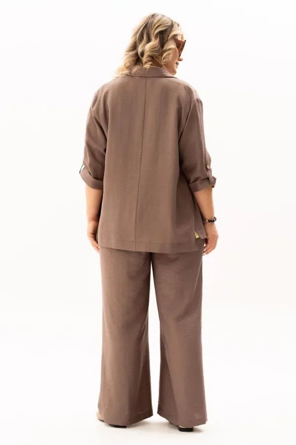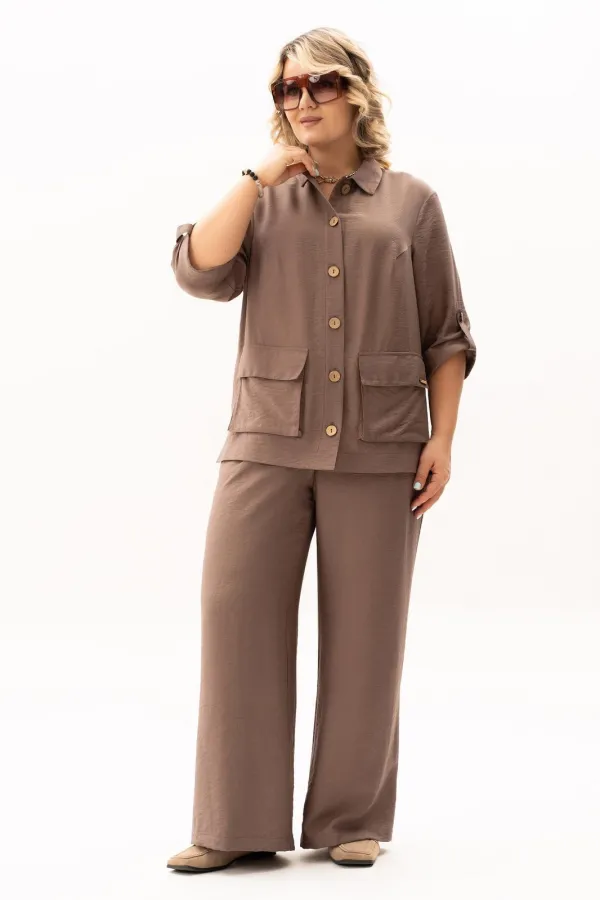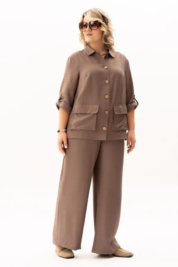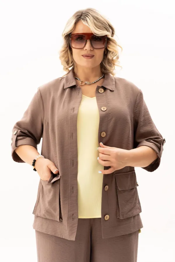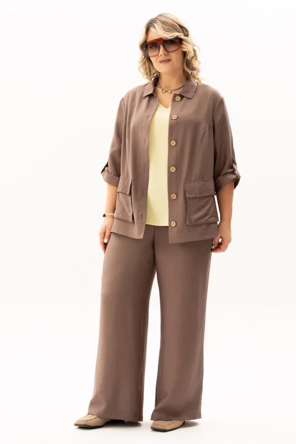 Стильный комплект-тройка: жакет с брюками и созвучной майкой – это стильное и комфортное решение для женщин больших размеров, идеальный выбор для тех, кто ценит комфорт и стиль. Модель выполнена из ткани натурального волокна - хлопка с добавлением полиэстера и эластана, что позволяет чувствовать прохладу в жару, она прекрасно сидит на фигуре, обеспечивая свободу движений и приятные тактильные ощущения. Жакет свободного прямого кроя со спущенными рукавами, застегивается на 5 пуговиц и дополнен двумя накладными карманами, по боковым швам обработаны разрезы, низ жакета асимметричный. Блуза с рукавом «крылышко», горловина углубленная V-образной формы, на правом боковом шве есть декоративная нашивка. Брюки прямого кроя «палацо» и боковыми карманами обеспечивают удобную посадку. Свободный крой комплекта позволяет носить его в офисе, и в повседневной жизни. Модель представлена в широком размерном ряде, что делает ее доступной для женщин с любыми параметрами. Этот идеальный женский комплект позволяет создать несколько образов на любой случай.