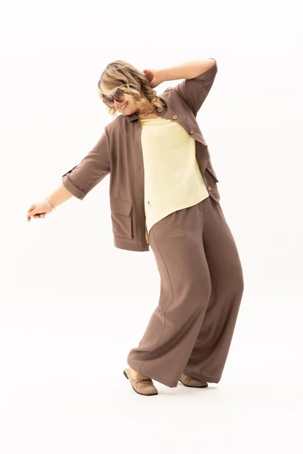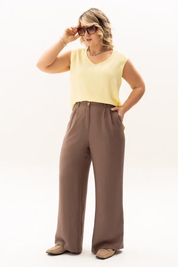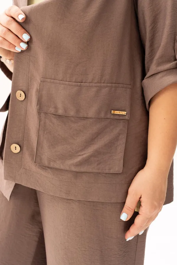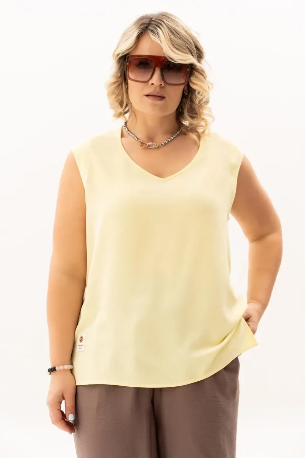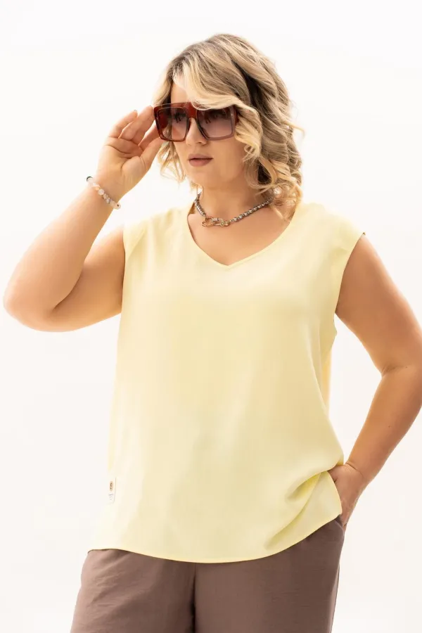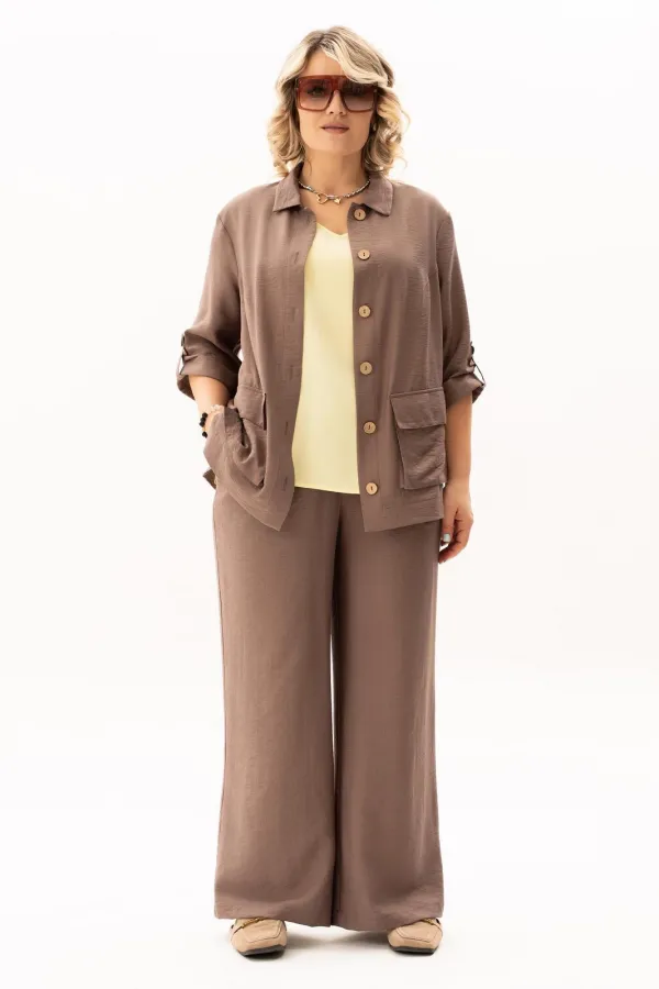 Стильный комплект-тройка: жакет с брюками и созвучной майкой – это стильное и комфортное решение для женщин больших размеров, идеальный выбор для тех, кто ценит комфорт и стиль. Модель выполнена из ткани натурального волокна - хлопка с добавлением полиэстера и эластана, что позволяет чувствовать прохладу в жару, она прекрасно сидит на фигуре, обеспечивая свободу движений и приятные тактильные ощущения. Жакет свободного прямого кроя со спущенными рукавами, застегивается на 5 пуговиц и дополнен двумя накладными карманами, по боковым швам обработаны разрезы, низ жакета асимметричный. Блуза с рукавом «крылышко», горловина углубленная V-образной формы, на правом боковом шве есть декоративная нашивка. Брюки прямого кроя «палацо» и боковыми карманами обеспечивают удобную посадку. Свободный крой комплекта позволяет носить его в офисе, и в повседневной жизни. Модель представлена в широком размерном ряде, что делает ее доступной для женщин с любыми параметрами. Этот идеальный женский комплект позволяет создать несколько образов на любой случай.