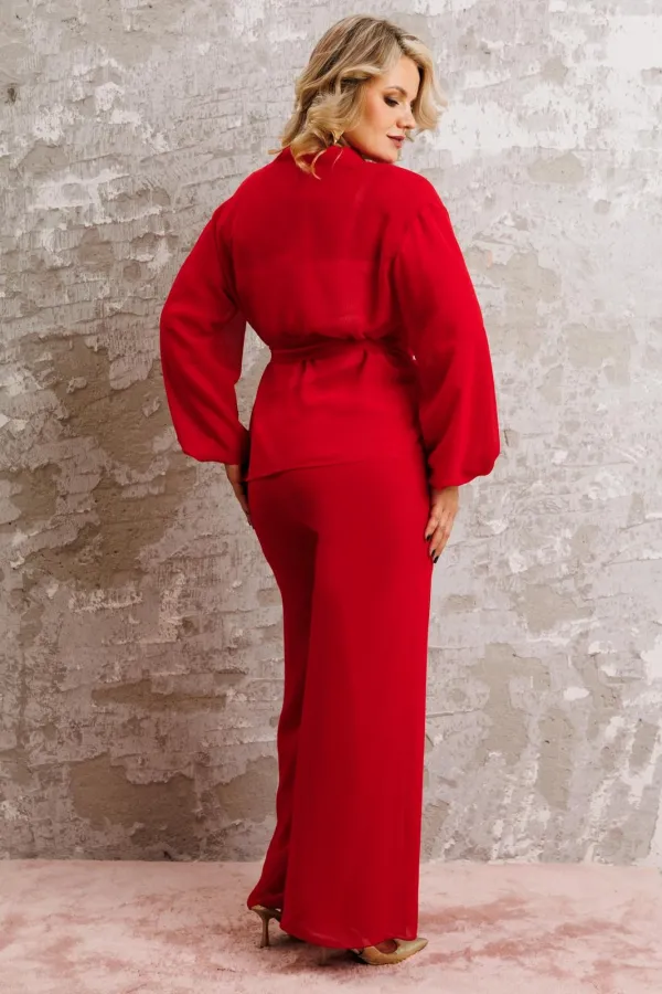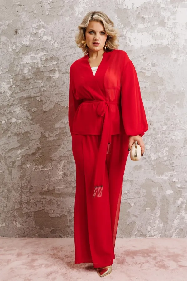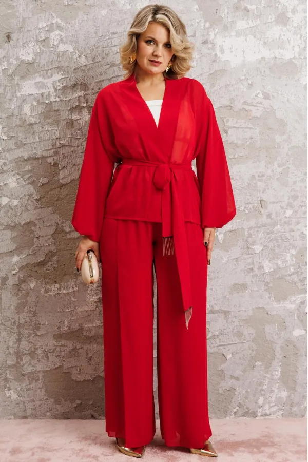 Элегантный вечерний костюм-двойка из шифона, состоящий из блузки свободного кроя и широких брюк. Красивый и эффектный брючный костюм - это идеальный образ для особых случаев, вечерних выходов, праздничных и торжественных мероприятий, будь то корпоратив, свадьба, юбилей, выпускной, день рождения, Новый год Блузка прямого силуэта из шифона со пущенной линией плеча. Рукав двойной, расширенный к низу со складками. По спинке и полочке идет планка. В комплекте с блузкой идет съемный пояс. На концах пояса металлизированная бахрома. Брюки прямые на трикотажной подкладке масло, с запахом по переду, пояс на резинке.Благодаря фасону и крою, костюм визуально вытянет силуэт, сделает фигуру стройнее, подчеркнет ее достоинства, скроет недостатки. Элегантный брючный костюм от Anastasia- комфорт и уверенность в себе на любом мероприятии Длина блузки: (48-56)-61см. Длина рукава-52см. Длина брюк:(48-54)-105см., (56)-108см.