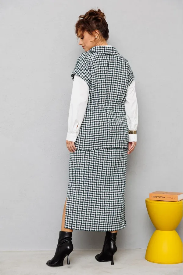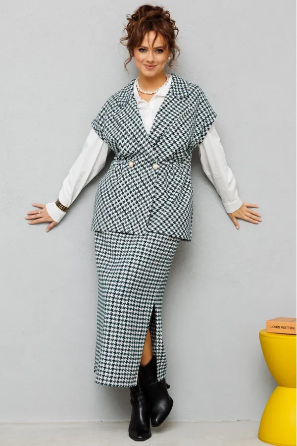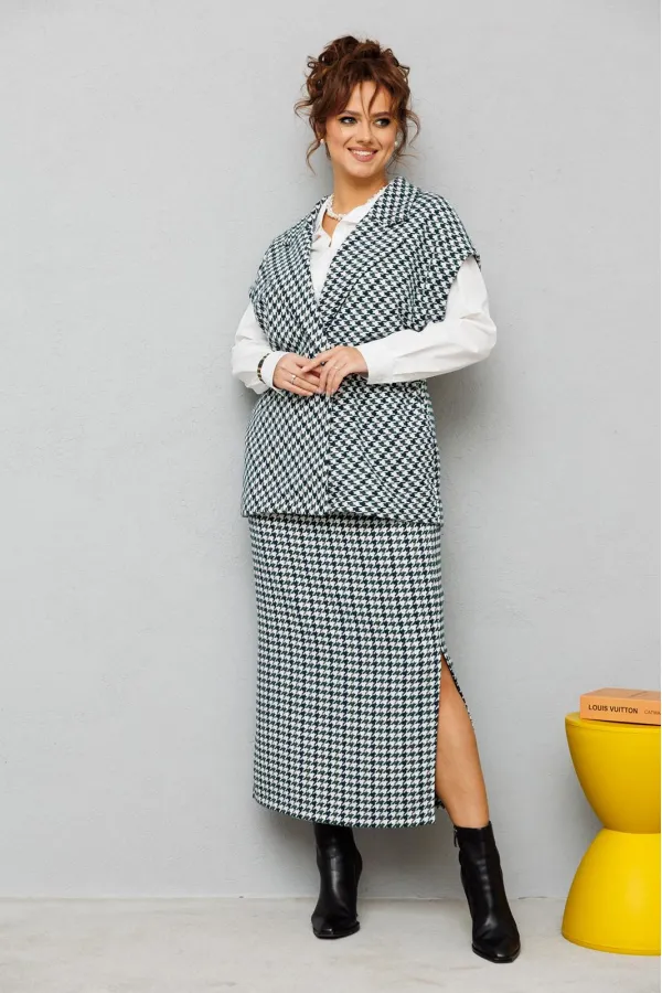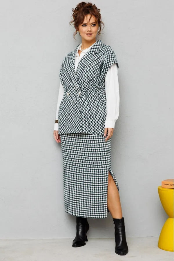 Бренд белорусской женской одежды больших размеров Anastasia представляет костюм двойку. Костюм женский 2-х предметный (жилет, юбка) из костюмной ткани (принт гусиная лапка) станет отличным дополнением к Вашему гардеробу. Подойдет для повседневной носки (работа, офис, прогулки). Достаточно дополнить его соответствующими предметами из вашего гардероба: блузка, майка, водолазка, гольф, свитер, лонгслив, свитшот. Жилет прямого силуэта, со спущенным плечом. Может быть самостоятельным элементом гордерба. Застежка двухбортная, воротник английского типа. Рисунок по полочке идет по косой, грудовая выточка из бокового шва, по спинке средний шов, по талии кулиска-резинка, по бокам -карманы. Юбка-макси, зауженная к низу, по бокам разрезы. Пояс отрезной на резинке. Благодаря своему крою и фасону костюм подчеркивает женственные формы и скрывает то, что должно быть незаметным. Это повседневный вариант на каждый день для занятий в школе или для офиса, на работу или на прогулку. Наденьте его на деловую встречу, официальное мероприятие, школьное торжество. Модель подойдёт для образа в университет или колледж. Этот предмет одежды подчеркнет вашу элегантность и сделает образ более женственным. Длина по спинке (48-52)-70 см, (54-58)-71 см. Длина юбки (48-58) - 88 см.