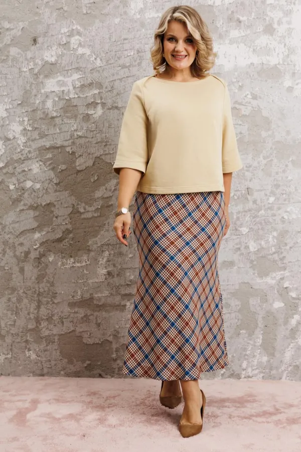 Комплект женский 2-х предметный (блузка, юбка). Отлично подойдет на любой тип фигуры, подчеркнет вашу женственность. Блузка из трикотажного полотна футер прямого силуэта. По переду нагрудные вытачки с бокового шва. Горловина в форме лодочки. Рукав одношовный, втачной, 3/4 длины. В качестве декора- металическая нашивка с логотипом фирмы по низу блузки. Юбка по косой. Пояс на резинке. Длина блузы-55 см . Длина рукава -41см. Длина юбки - 92см.