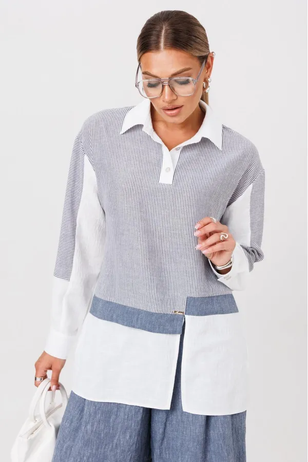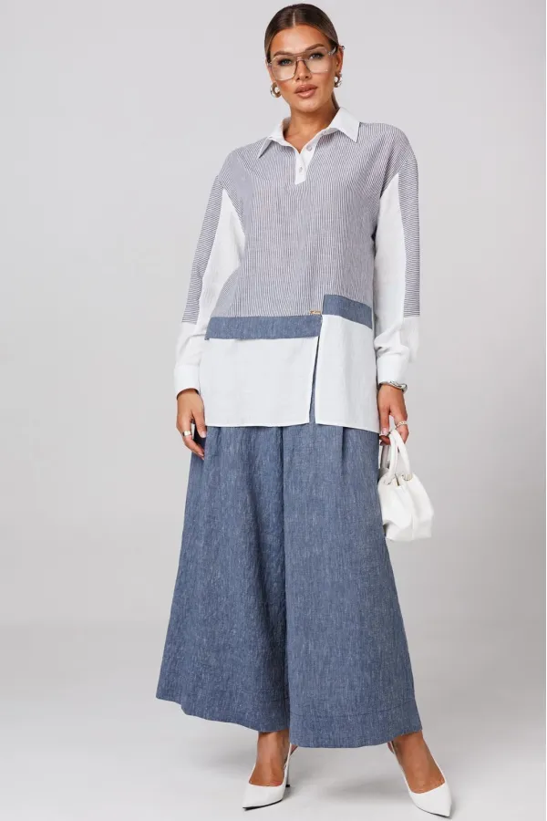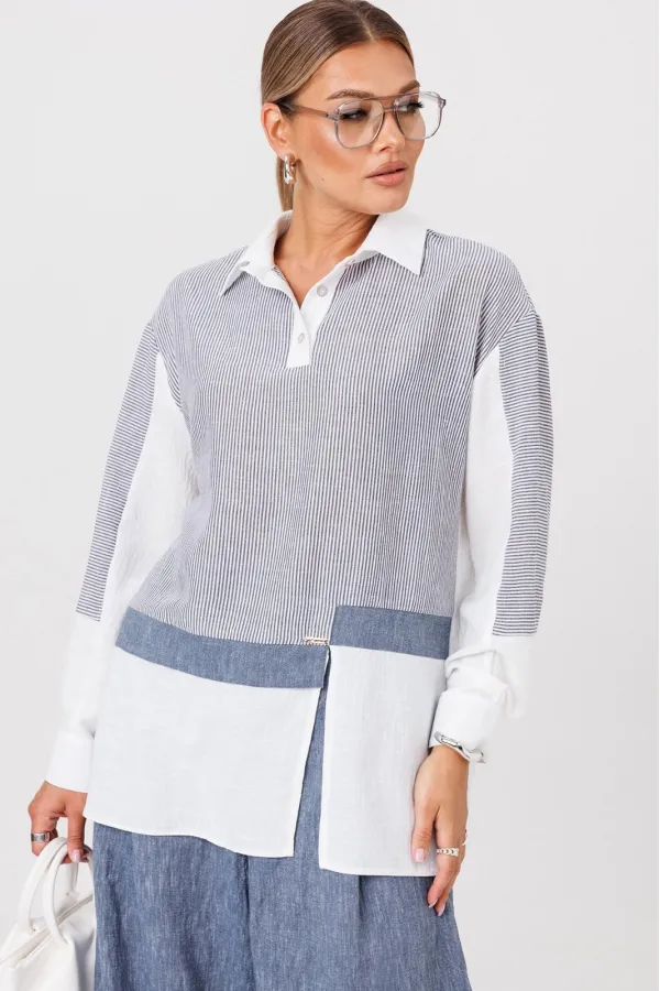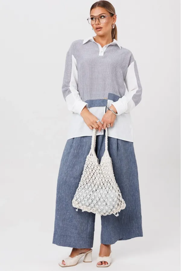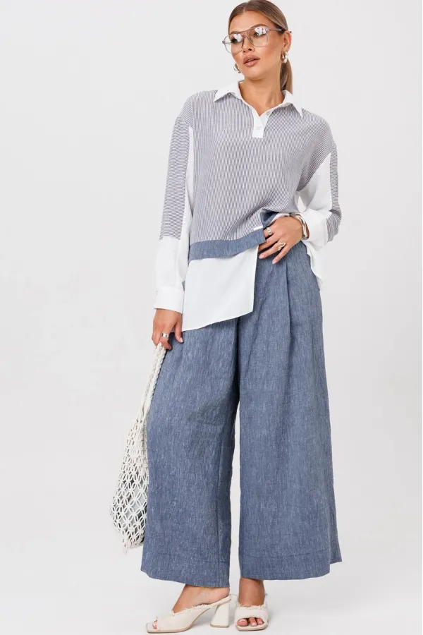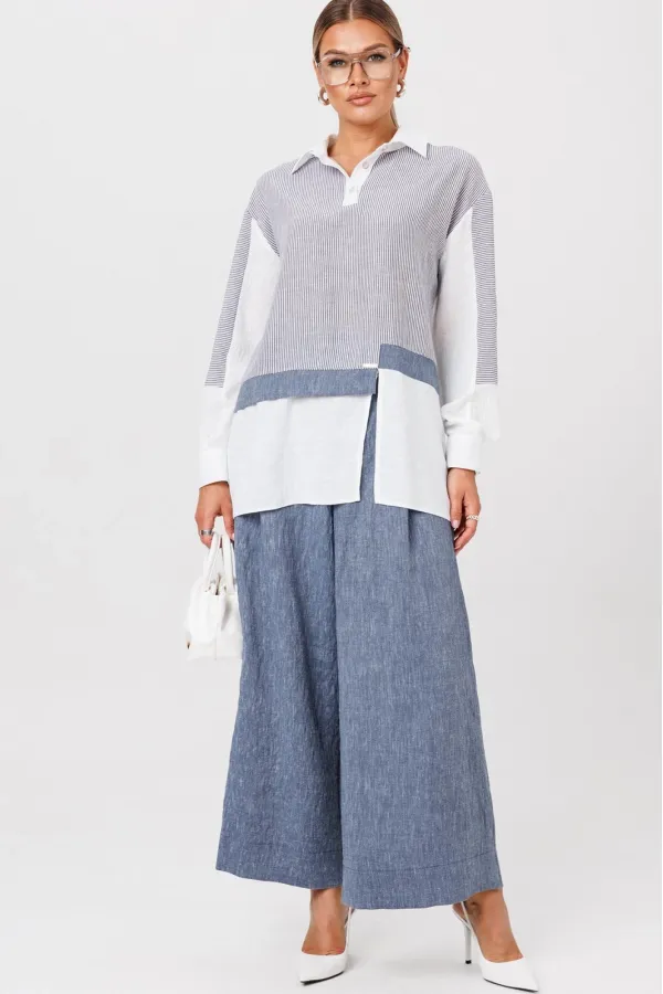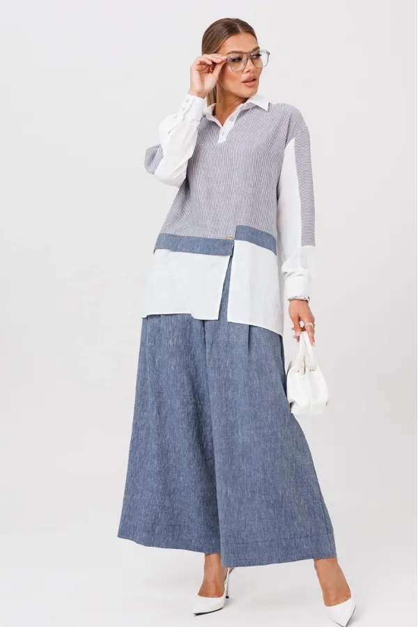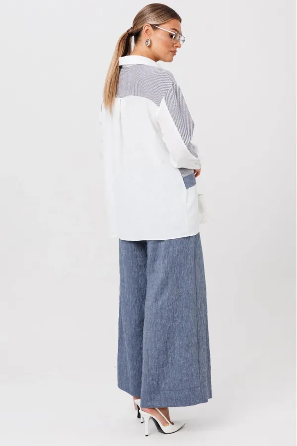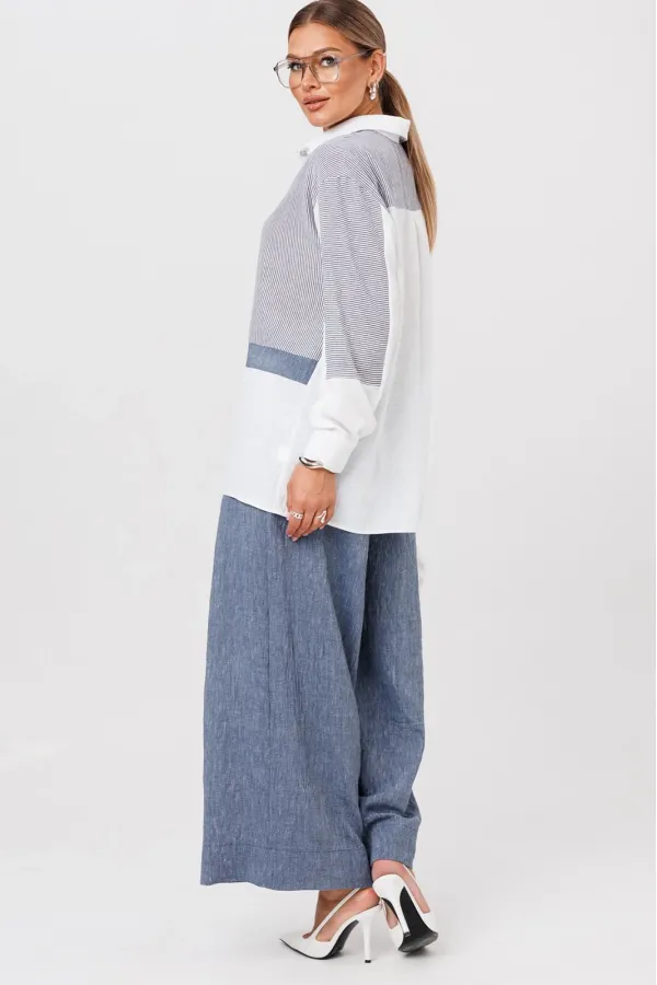 Комплект создан для тех, кто ценит комфорт и элегантность в каждой детали. В комплект входит блузка и штаны палаццо. Оверсайз крой придаёт костюму особый шарм, а легкая невесомая ткань дает свободу движений. Высокая посадка и резинка по поясу подчёркивает талию и делает силуэт более изящным. Смесь натуральных материалов позволяет пропускать воздух и отводить влагу, что особенно важно в жаркую погоду и прохладное утро. Ткань не мнется. Благодаря свободному крою костюм подойдёт для разных типов фигуры. Он подчеркнёт вашу индивидуальность и станет отличным дополнением к вашему летнему гардеробу. Этот брючный костюм — не просто одежда, это заявление о вашем стиле и вкусе. В нём вы будете чувствовать себя уверенно и комфортно, зная, что выглядите на все сто. Выбирая этот костюм, вы выбираете качество, комфорт и стиль. Выберите льняной костюм и наслаждайтесь летом в полной мере!Блузка прямого силуэта, застежка на планку и пуговицы. Воротник на отрезной стойке. По полочке идет ассиметричный подрез со вставками из 2-х видов однотона и разрезом. Плечо спущенное, рукав длинный со вставками из ткани в полоску, на манжете. По спинке идет кокетка из ткани в полоску и встречная складка. Брюки полаццо прямые с односторонней складкой и запахом по центру. По низу брюк широкая подгибка.Пояс на резинке . В качестве декора- брендированная металлическая нашивка по подрезу полочки. Длина по спинке (50-54) - 74 см, (56-60) - 76 см. Длина рукава (с манжетой): (50-54) - 57 см, (56-60)-59см. Длина брюк: (50-54) - 98 см, (56-60) - 99 см.