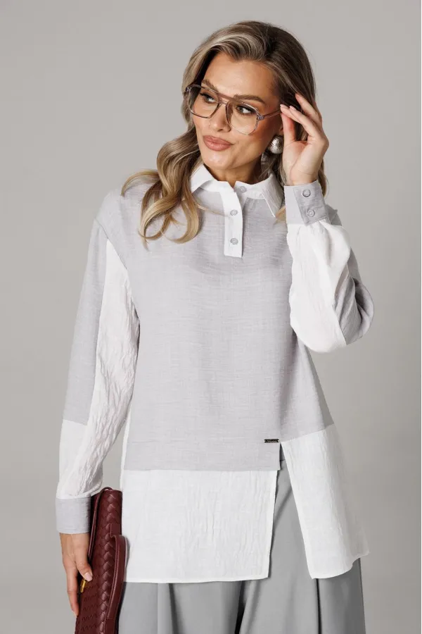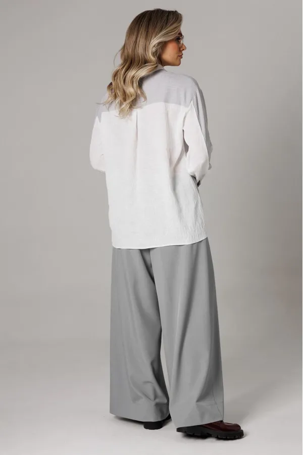 Комплект из костюмной ткани создан для тех, кто ценит комфорт и элегантность в каждой детали. В комплект входит блузка и штаны палаццо. Оверсайз крой придаёт костюму особый шарм и дает свободу движений. Высокая посадка и резинка по поясу подчёркивает талию и делает силуэт более изящным. Благодаря свободному крою костюм подойдёт для разных типов фигуры. Он подчеркнёт вашу индивидупльность. Блузка прямого силуэта, застежка на планку и пуговицы. Воротник на отрезной стойке. По полочке идет ассиметричный подрез со вставками из 2-х видов однотона и разрезом. Плечо спущенное, рукав длинный со вставками, на манжете. По спинке идет кокетка и встречная складка. Брюки полаццо , прямые с односторонней складкой и запахом по центру. По низу брюк широкая подгибка. Пояс на резинке . В качестве декора- брендированная металлическая нашивка по подрезу полочки. Длина по спинке (50-54) - 74 см, (56-60) - 76 см. Длина рукава (с манжетой): (50-54) - 57 см, (56-60)-59см. Длина брюк: (50-54) - 97 см, (56-60) - 98см