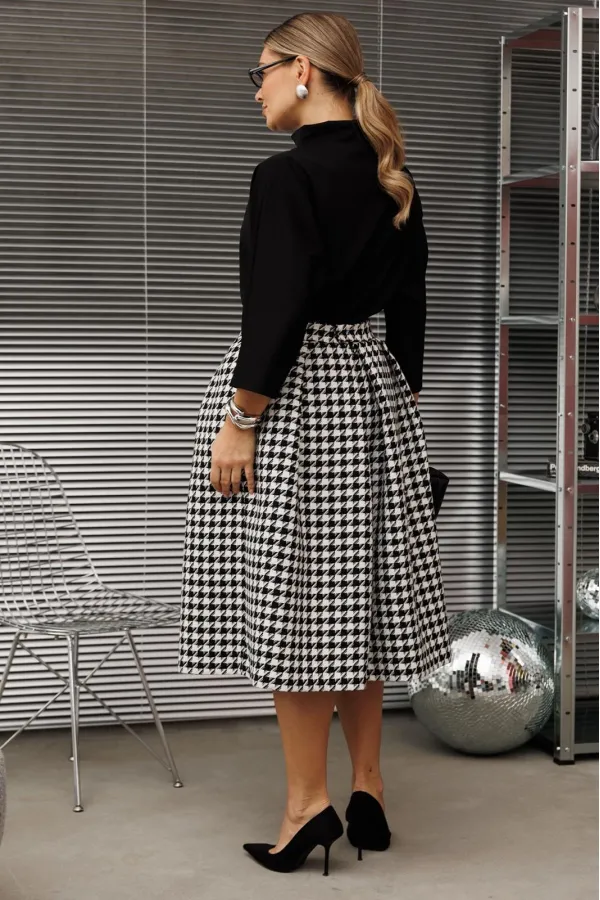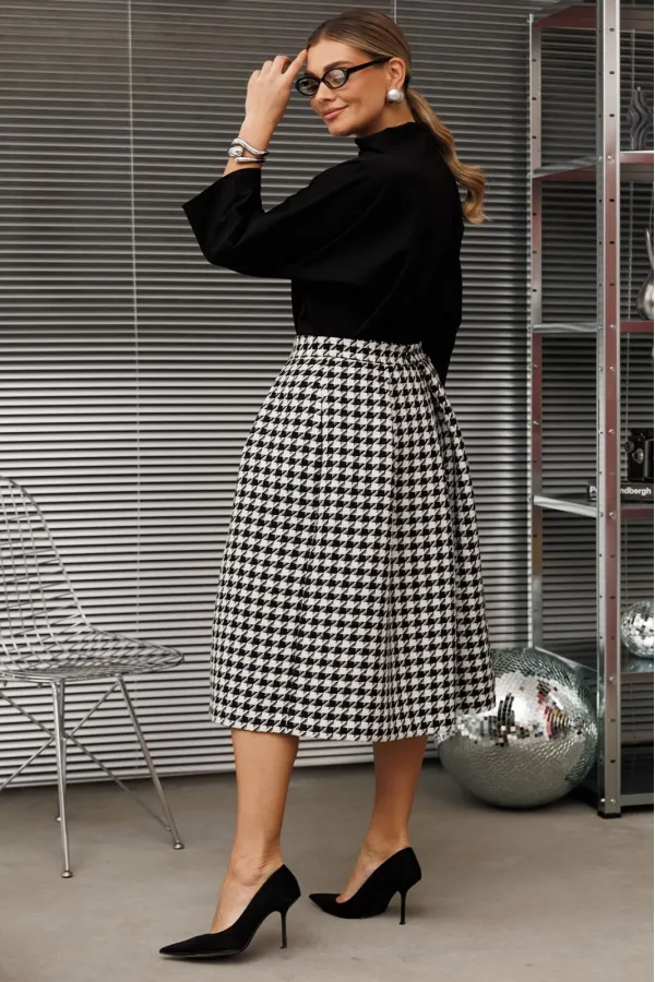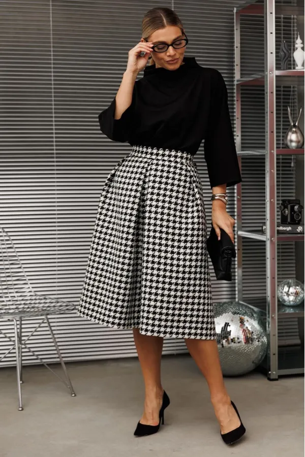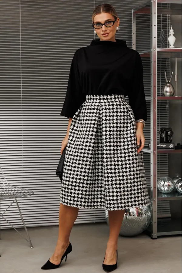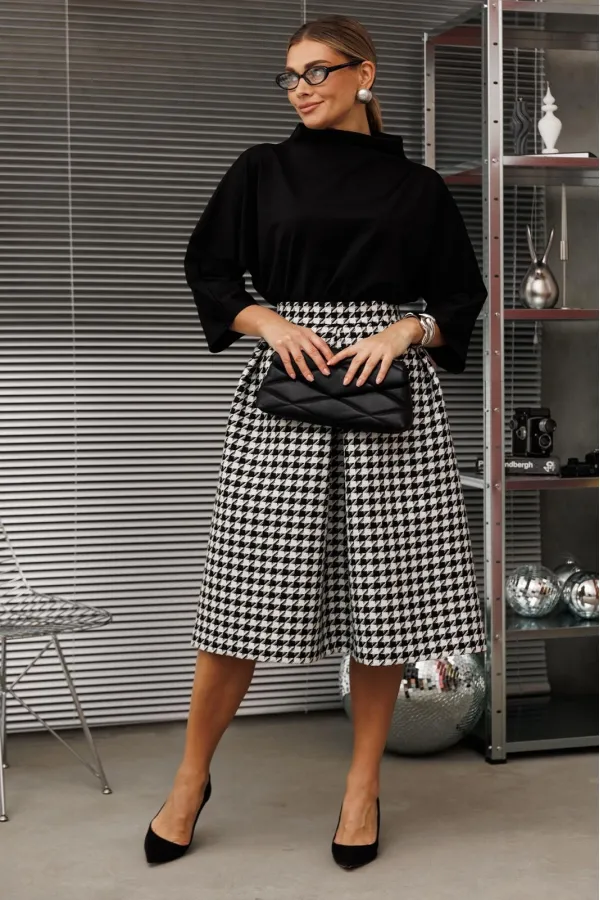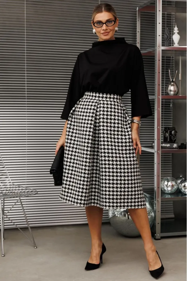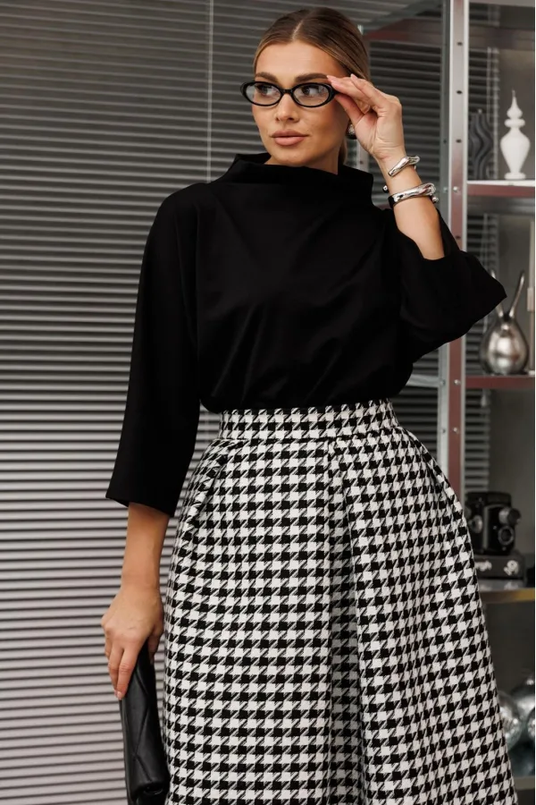 Представляем вашему вниманию стильный и уютный комплект, который станет настоящим маст-хэвом в вашем гардеробе. Классический дизайн в стиле олд мани создает атмосферу расслабленности и уюта, что особенно приятно в прохладные осенние и зимние дни. Этот комплект станет вашим верным спутником в любой ситуации, добавляя нотки элегантности и шарма в вашу повседневную жизнь. Отражает роскошь, придает элегантность и изысканность, будет великолепно смотреться на любой фигуре и привлечет к вам внимание окружающих. Комплект женский 2-х предметный (блузка, юбка).Блузка женская ,прямого силуэта, из трикотажного полотна , со спущенным плечом. Рукав летучая мышь, 3/4 длины. Горловина цельнокроенная в виде стойки. Юбка из фактурной ткани в рубкик с принтом гусиная лапка - теплая, плотная и качественная, практически не мнется. В верхней части идут складки: по центру-встречная, по бокам - односторонние. Пояс отрезной, по бокам карманы. Застежка по спинке на потайную молнию и пуговицу. Юбка на подкладке. Отдельные части комлекта будут легко сочитаться с вещеми из вашего гардероба. Длина блузки(по спинке): (50-56)-65 см. Длина рукава от головины: (50-56) -56 см. Длина юбки - 72см.