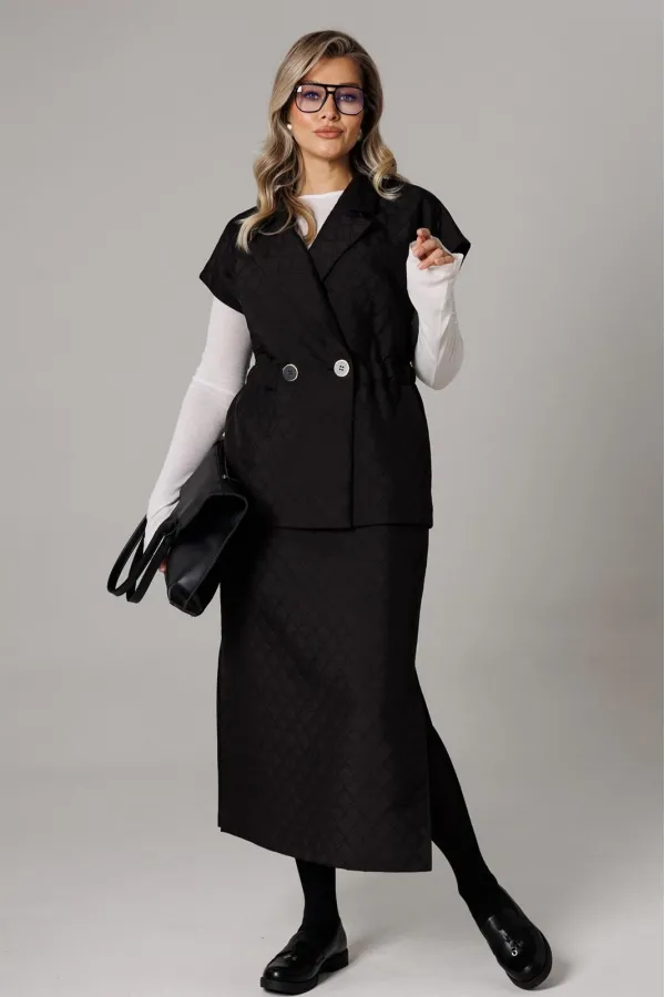Бренд белорусской женской одежды больших размеров Anastasia представляет костюм двойку. Костюм женский 2-х предметный (жилет, юбка) из стеганной ткани станет отличным дополнением к Вашему гардеробу. Подойдет для повседневной носки (работа, офис, прогулки). Достаточно дополнить его соответствующими предметами из вашего гардероба: блузка, майка, водолазка, гольф, свитер, лонгслив, свитшот. Жилет прямого силуэта, со спущенным плечом. Может быть самостоятельным элементом гордерба. Застежка двухбортная, воротник английского типа. По полочке идет грудовая выточка из бокового шва, по спинке средний шов, по талии кулиска-резинка, по бокам -карманы. Юбка-макси, зауженная к низу, по бокам разрезы. Пояс отрезной на резинке. Благодаря своему крою и фасону костюм подчеркивает женственные формы и скрывает то, что должно быть незаметным. Это повседневный вариант на каждый день для занятий в школе или для офиса, на работу или на прогулку. Наденьте его на деловую встречу, официальное мероприятие, школьное торжество. Модель подойдёт для образа в университет или колледж. Этот предмет одежды подчеркнет вашу элегантность и сделает образ более женственным. Длина по спинке (48-52)-70см, (54-58)-71 см. Длина юбки (48-58) - 88см.